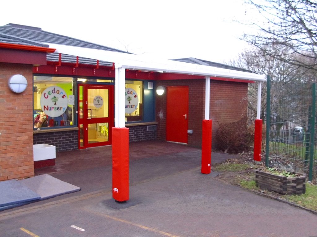 We installed a 6m x 4m Coniston Wall Mounted Canopy at Cedars Community Infant & Nursery School. The Coniston canopy offers up to 99% protection from UV rays, helping to ensure the children are protected from the sun whenever playing underneath it. As the canopy is wall mounted it offers uninterrupted cover from inside and out. They choose to have red post pads fitted to their canopy which matched the rest of the schools surrounding and prevents the children from bumping into the posts.