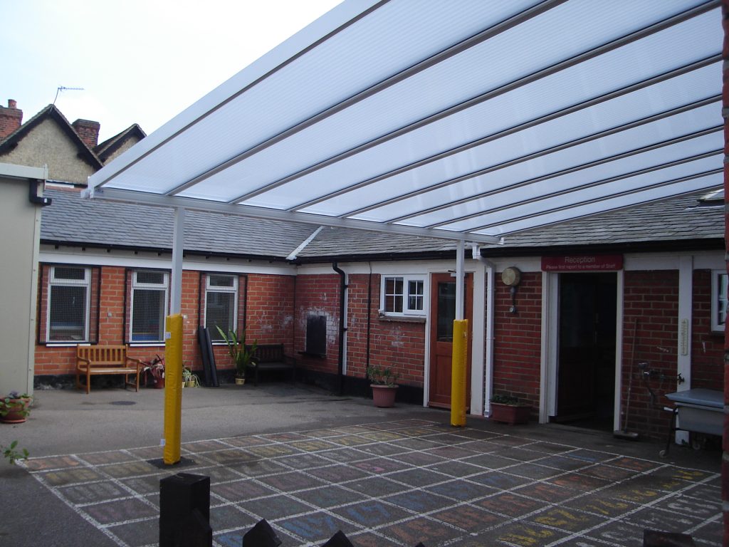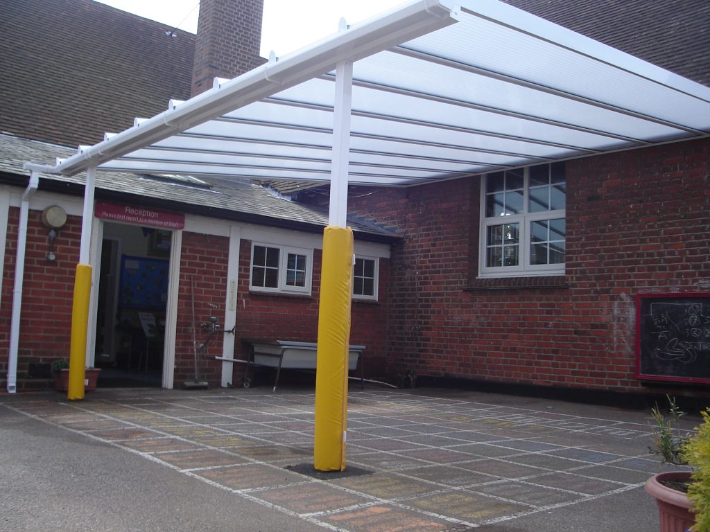 We installed two identical 5m x 5m Coniston Wall Mounted Canopies at Chigwell Row Infant School. This created two separate covered outdoor areas that can be used for outdoor play or learning because the Coniston creates shelter from rain and snow and shade from the sun. The school chose to have yellow post pads fitted to both of their canopies to ensure that the pupils will not get injured from bumping into the posts.