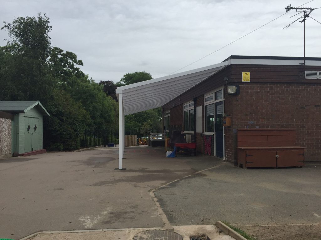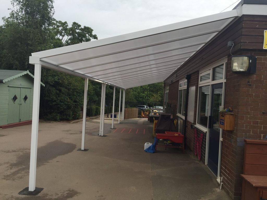 Our team of installers, installed a 16.8m x 3.5m Coniston Wall Mounted Canopy at Christ Church & St Peters Primary School in July 2016 which creates great shelter from rain and snow and shade from the sun with high UV protection allowing the students to enjoy the outdoors all year round.