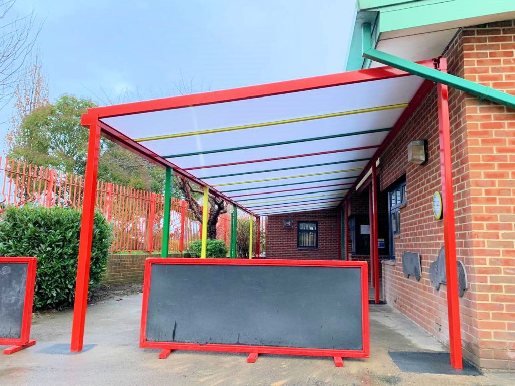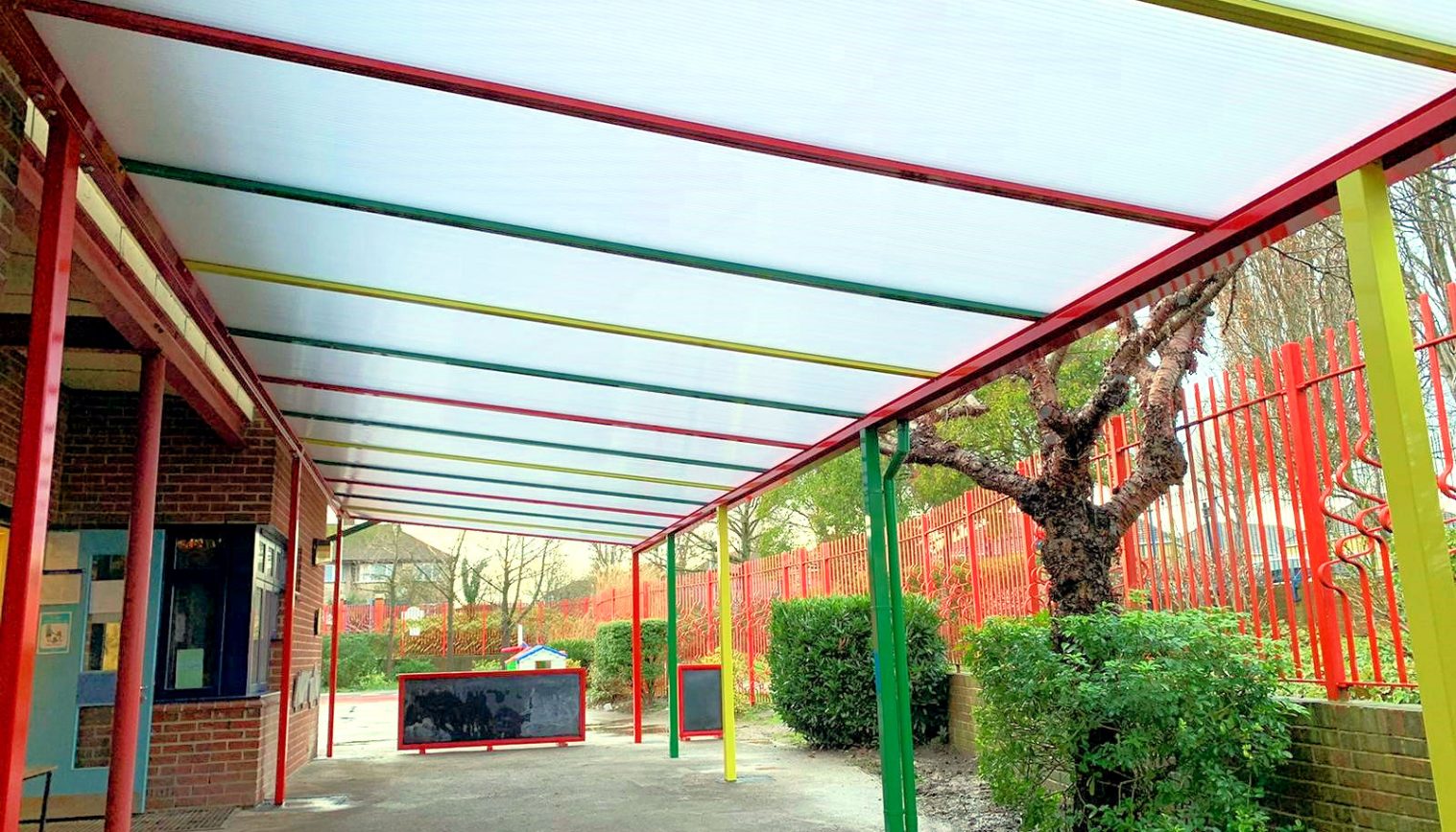They were looking to remove the current timber canopy which they had and replace it with a new up to date structure. The school choose the canopy to be coloured in red, green and yellow matching the buildings other surrounding and created a bright outdoor covered area that the pupils can use for play and learning all year round.