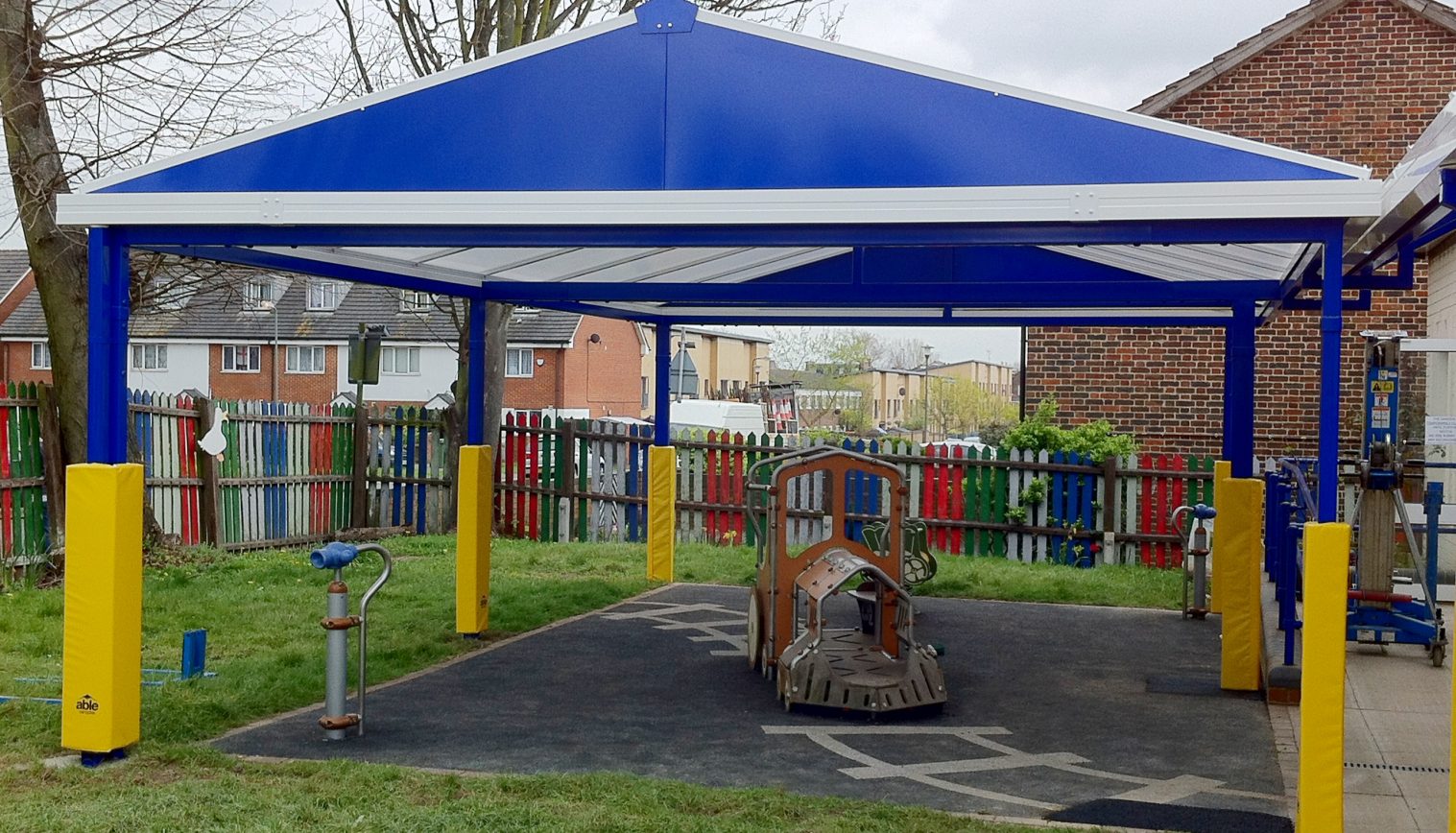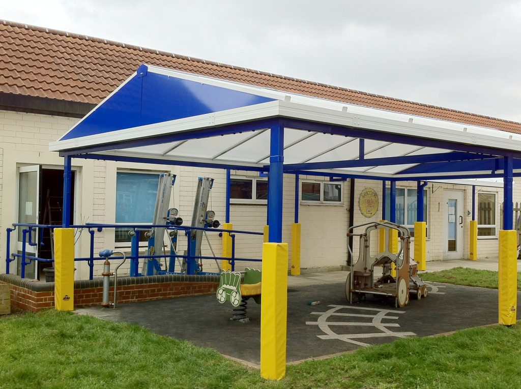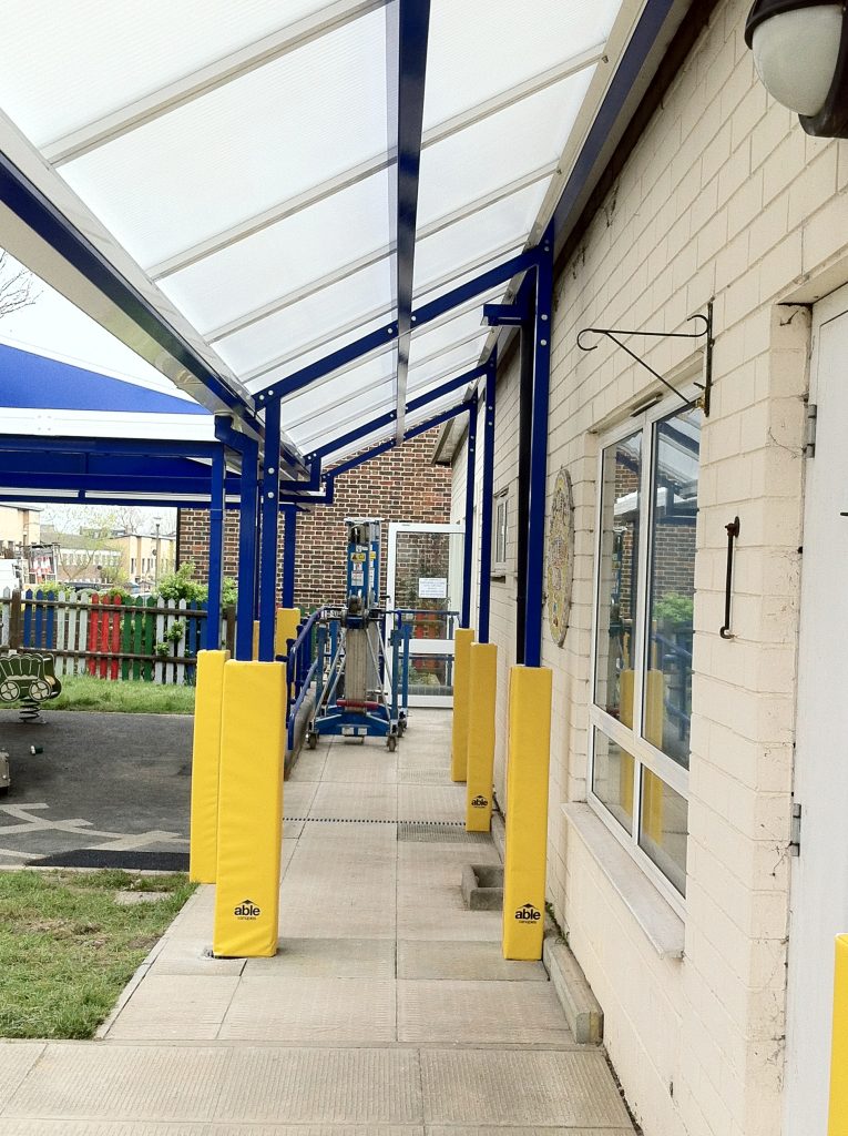 In March 2014, we installed a 7.5m x 5m Ullswater Apex Free Standing Canopy which we connected to a 9m x 1.8m Grange Junior Free Standing Canopy the small Junior Grange created cover from their door to the Ullswater canopy – allowing them to reach the covered play area on rainy days without getting wet. They chose for both canopies to be coloured. The post pads will help protect the children from knocks or bumps.