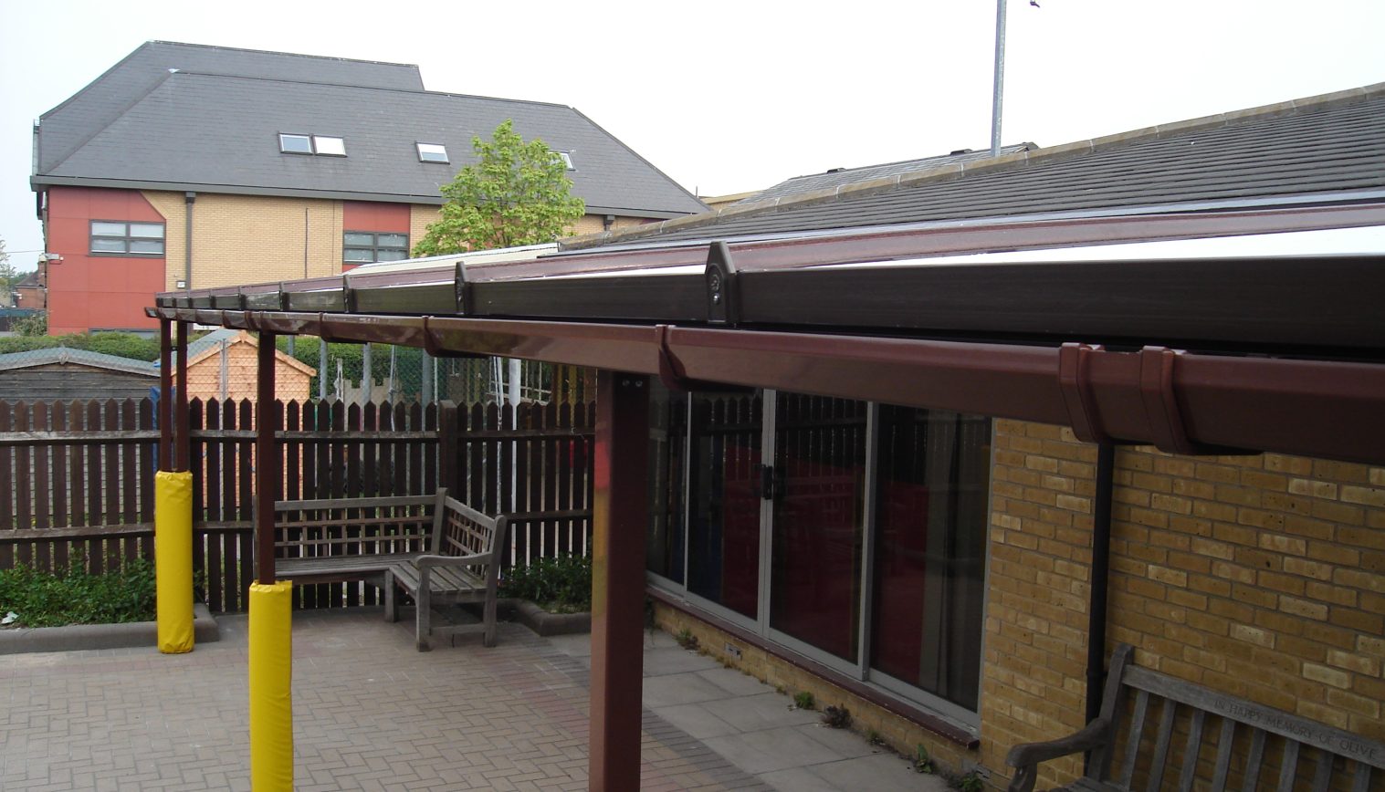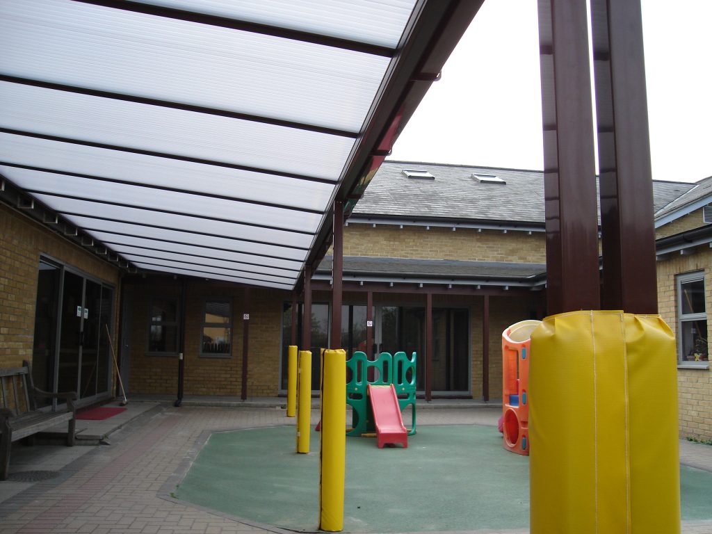 We installed a 12.5m x 3m Coniston Wall Mounted Canopy at Cornerstones Under 5’s. The Coniston created a covered outdoor area where their pupils could play and learn whilst protected from the weather. The school choose for the framework to be coloured to our woodgrain effect which matched the rest of the school decor. They chose to have yellow post pads fitted to their canopy preventing pupils from running into the posts.