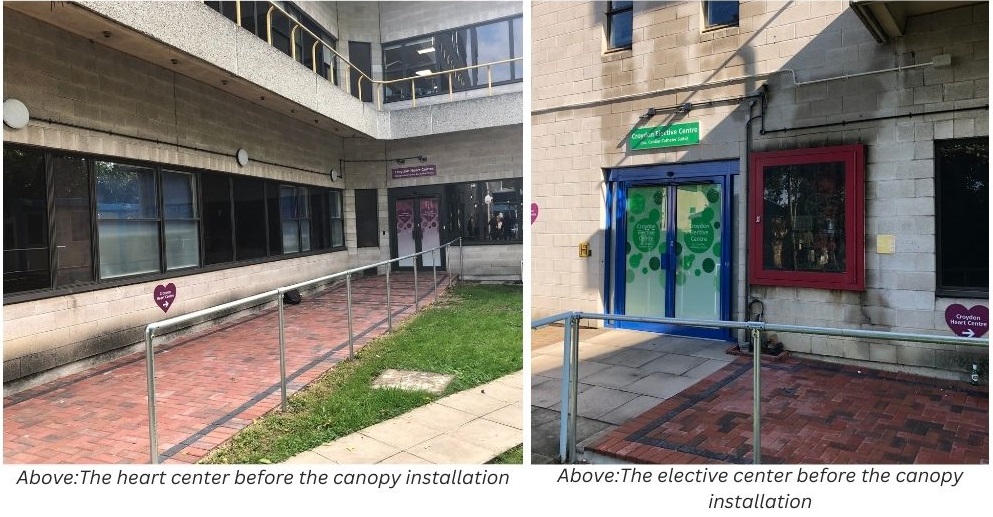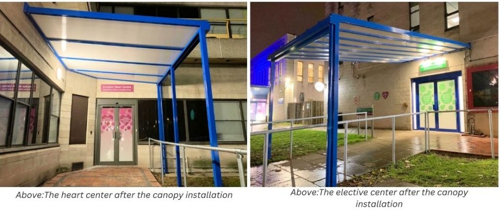 Fast forward to September 2020 when Foley Building Contractors were working on a project at the hospital which is run by the Croydon Health Services NHS Trust. Part of their works required several canopies to provide shade and shelter for their patients and visitors whilst queueing outside due to the social distancing measures that were in place. Because the summer had come to an end and the wintery weather was on the way, these canopies were needed with a quick turnaround.