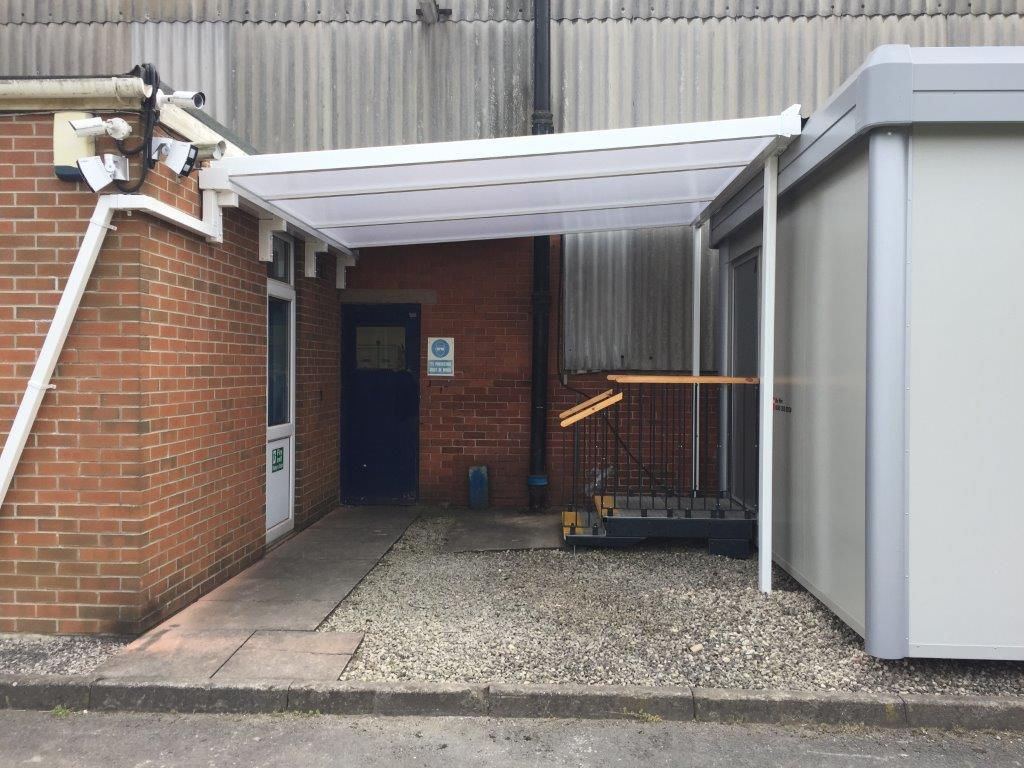 In April 2017, we installed 3.5m x 3.8m Coniston Wall Mounted Canopy at Doncaster Bramah in Sheffield on behalf of Portakabin. The canopy creates a shelter between the  main building and the Portakabin structure. This keeps the stair and entrance to the Portakabin building dry and safe for users.