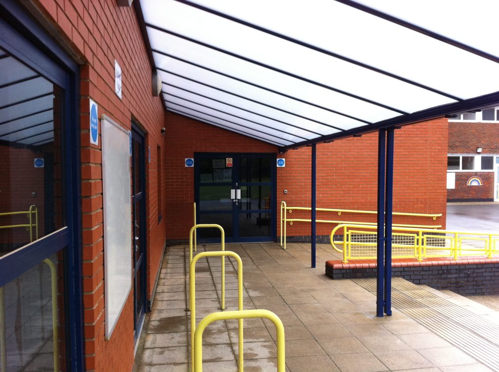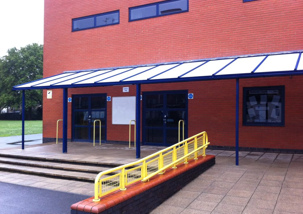 They choose the frame work to be blue which matched the school outside surroundings and the other canopy we have installed at the school which was a Whiteside Free Standing Entrance Canopy.