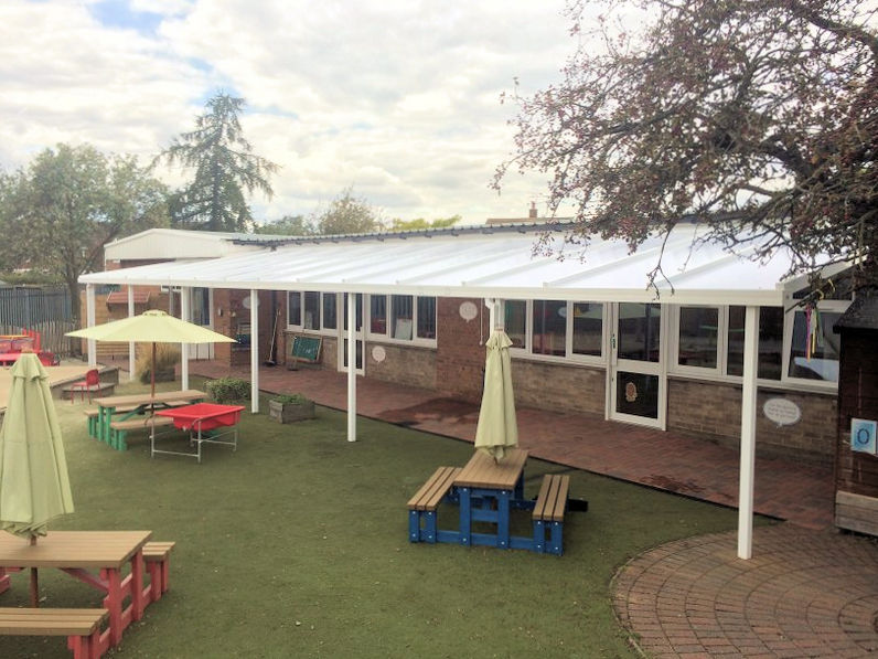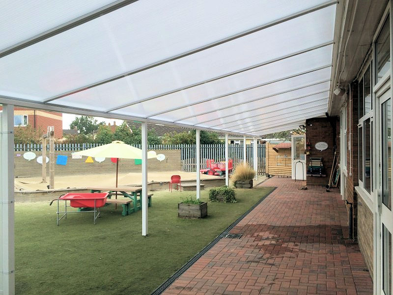 Our fitting team installed a 18m x 3.4m & 2.345m Coniston Wall Mounted Canopy at Fosse Way Academy in Lincolnshire. The Coniston creates a perfect outdoor covered area allowing outdoor play and learning all year round.