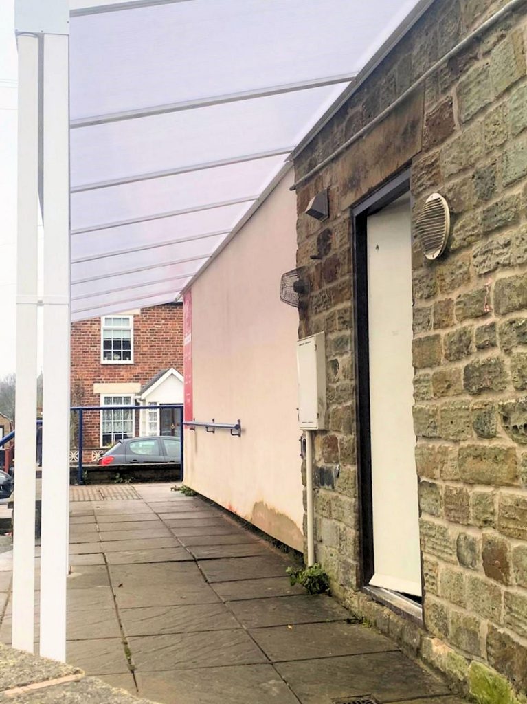 In November 2020, we supplied and installed a 9.6m x 1.6m Coniston Wall Mounted Canopy creating the perfect covered waiting area to the pharmacy keeping the patients sheltered whilst waiting.