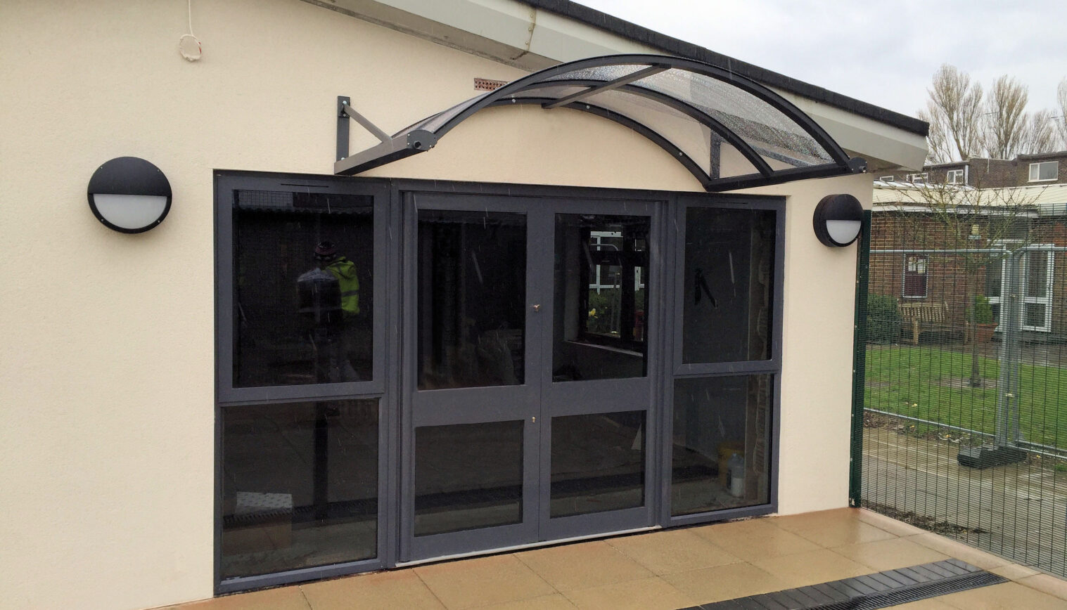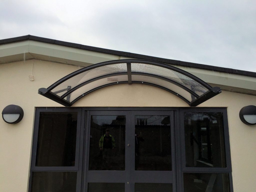 To meet the requirements we installed a 2.4m x 1.2m Colwyn Entrance Canopy in Marbled Grey to match the door frame.