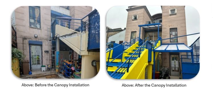 By August 2024, we successfully installed the first order of canopies at the nursery’s entrance. Impressed with the results, Hackney Care for Kids decided to expand their outdoor coverage further. In October 2024, they placed an additional order for two more Coniston canopies. One was 2.65m x 2m at the top of rear playground staircase, and the other was a 2.5m x 1.5m installed on the front entrance. Both were completed together in November 2024.