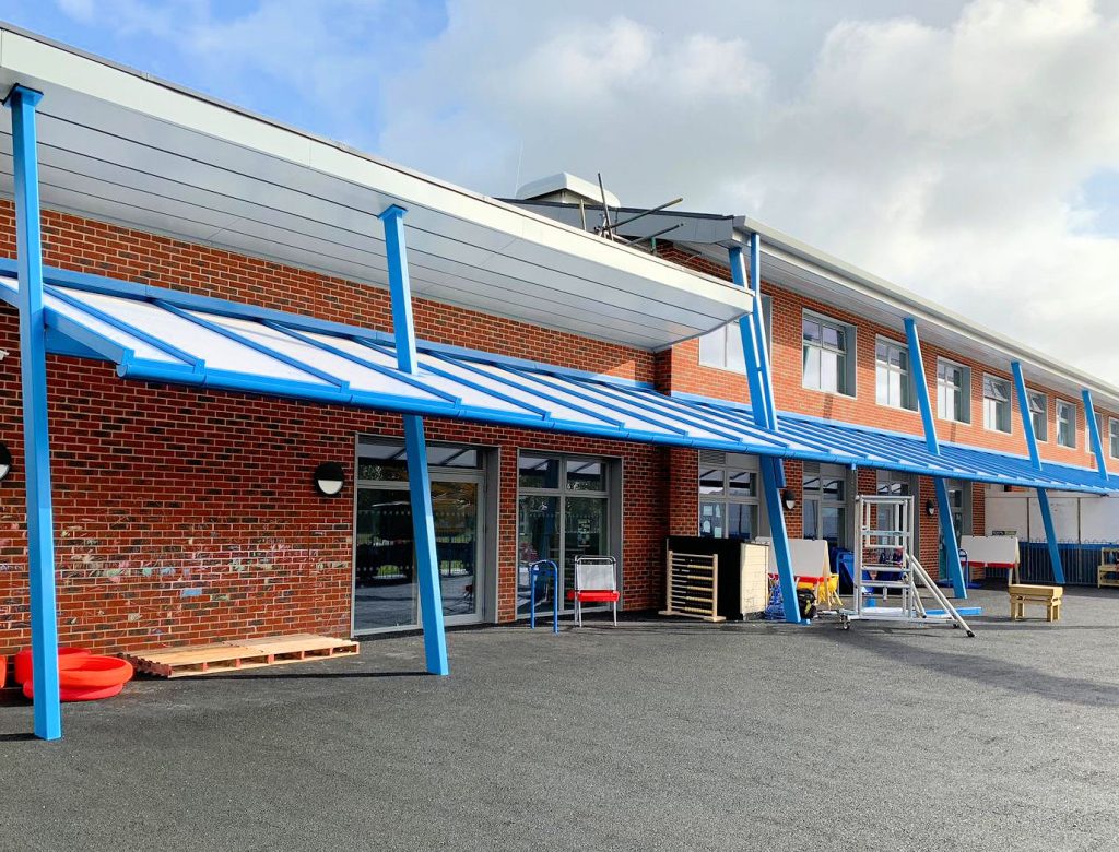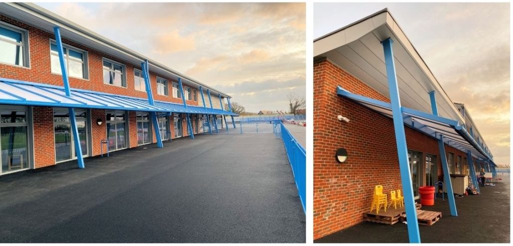 The end result was a striking canopy that will catch the attention of anyone walking towards the building which is also functional; the canopy provides 74.26 metres of uninterrupted, free-flow outdoor play and learning from a number of classrooms.