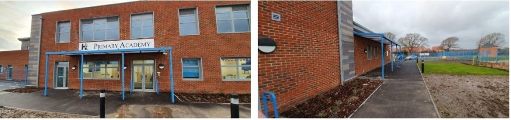 The two smaller Coniston wall mounted canopies are functional, branded structures that provide shade and shelter to the entrances of the school including the main entrance.