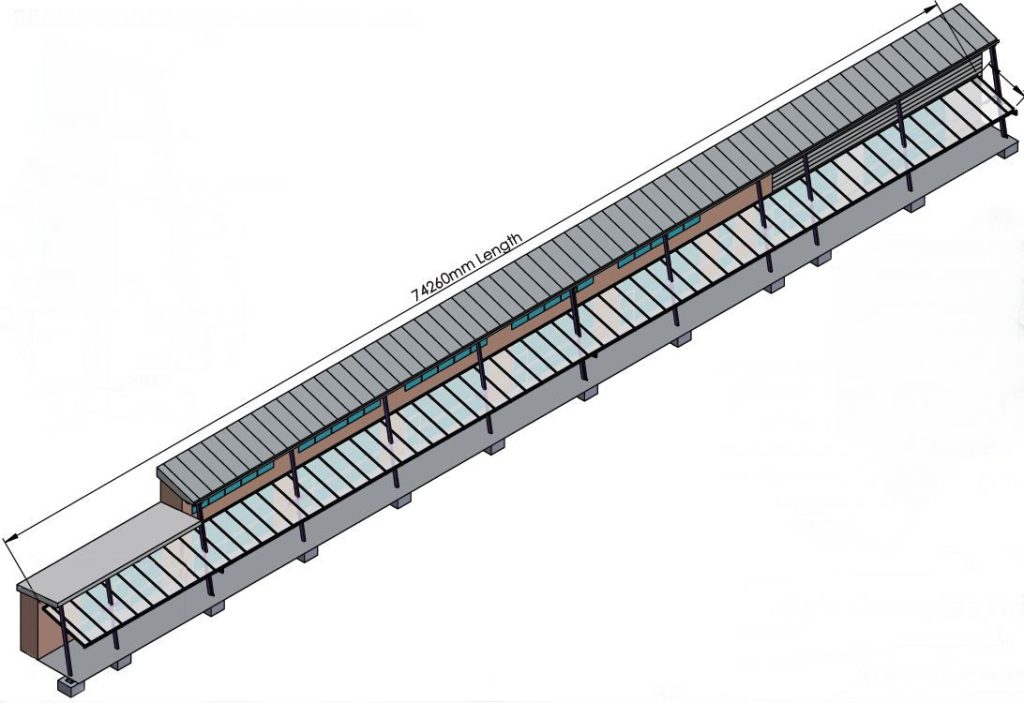 Product: 1no. Bespoke Coniston Wall Mounted Canopy: 74.26m x 3m – 3.5m