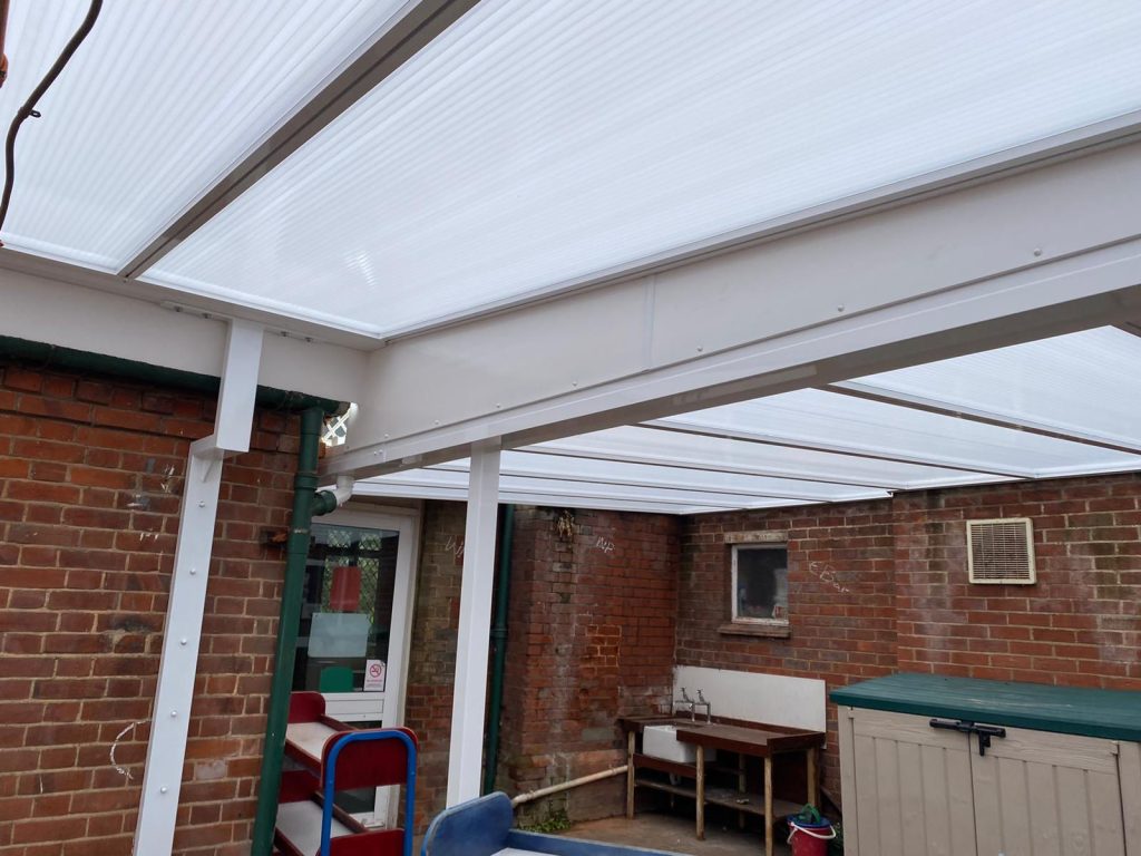 Once we had completed the free site survey, we went on to supply and install three Coniston Wall Mounted Canopies, meeting their requirements and creating more covered space for outdoor learning and activities.