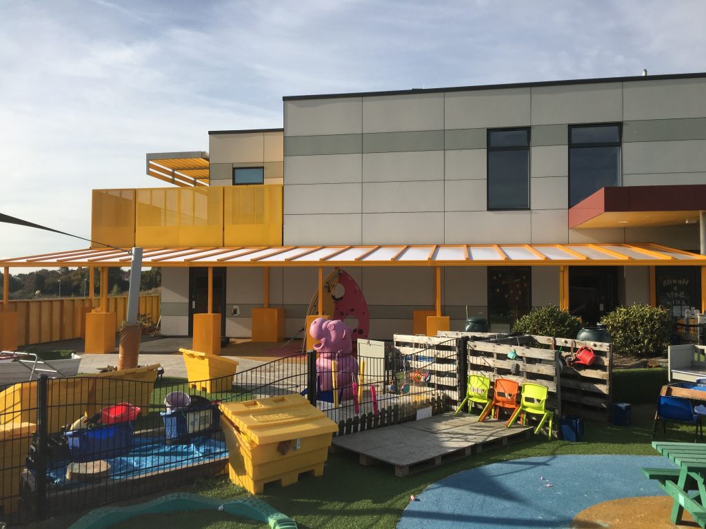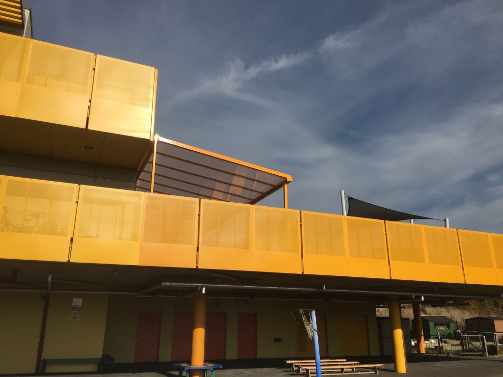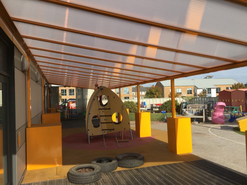 The canopy created a large covered outdoor play area at the school which will allow the pupils to enjoy the outdoors throughout the whole year. The school choose the canopy to be colour Melon Yellow to match the other surroundings.