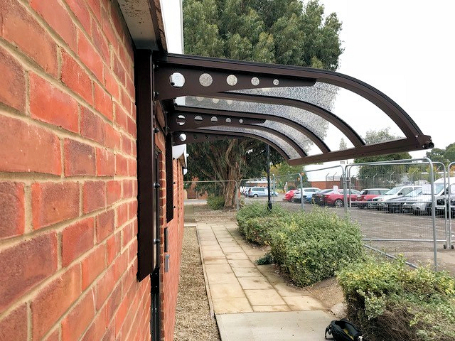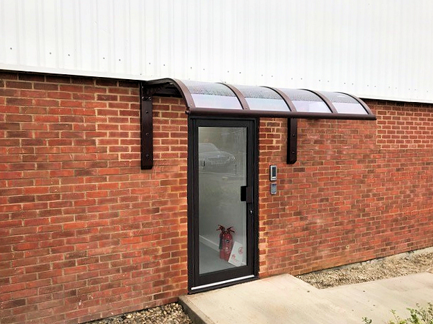 We installed a 2.1m x 1.2m chocolate brown Abberton Entrance Canopy creating the perfect stylish entrance to the building, meeting all their requirements and matching the surrounding colours.