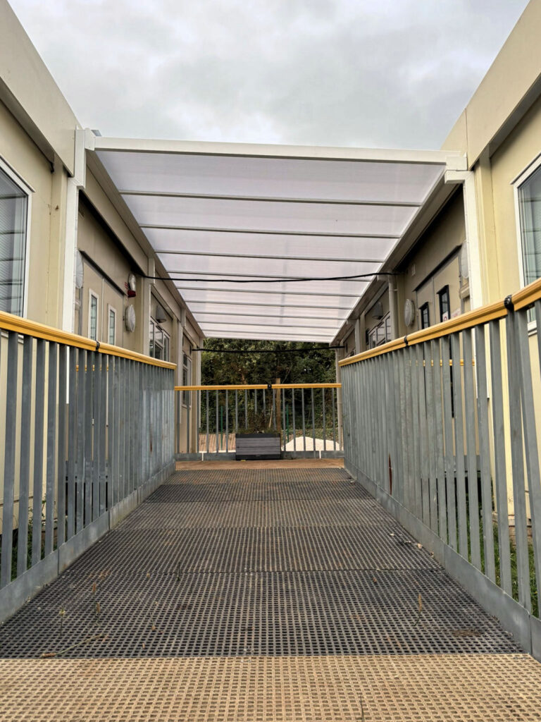 Kenton Primary School wanted to improve access and usability across their site by adding weather protection to a key outdoor walkway that connects to their modular buildings, supplied by Portakabin Ltd. The school’s main objective was to create safe, practical, and sheltered routes that students and staff could use comfortably throughout the year.