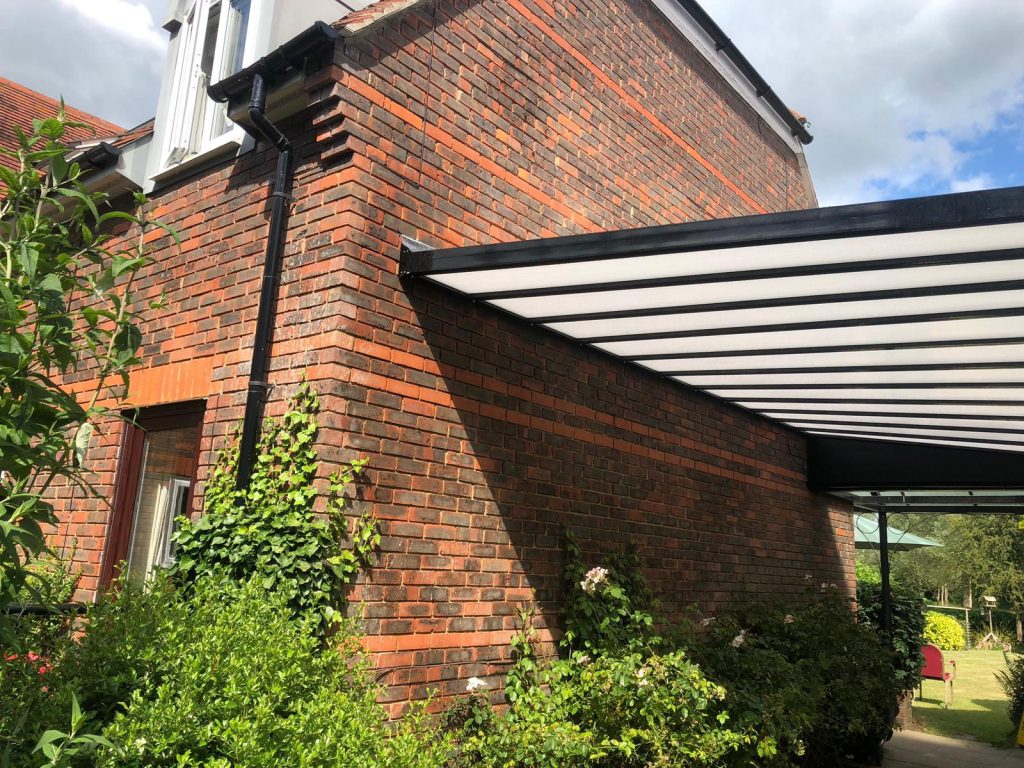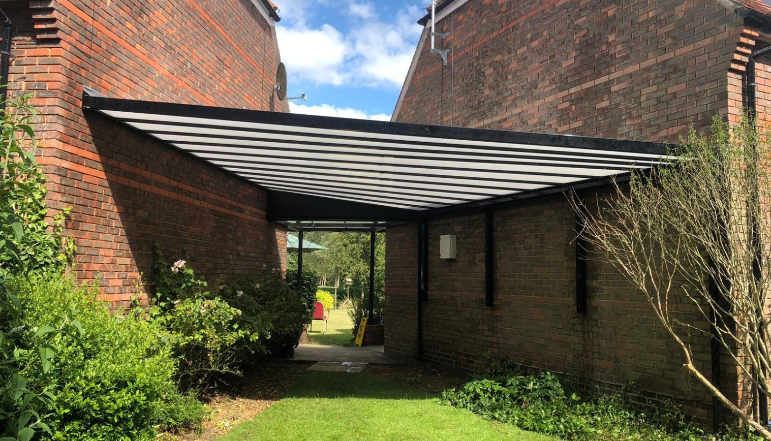 FirstPort Retirement Property Services were working on a project at Lake Meadow in Coggeshall, Essex. They were looking to provide cover to their mobility scooters. After discussing the different canopy options, we installed a 6m x 6m Coniston Wall Mounted Canopy tapering down into 3m.