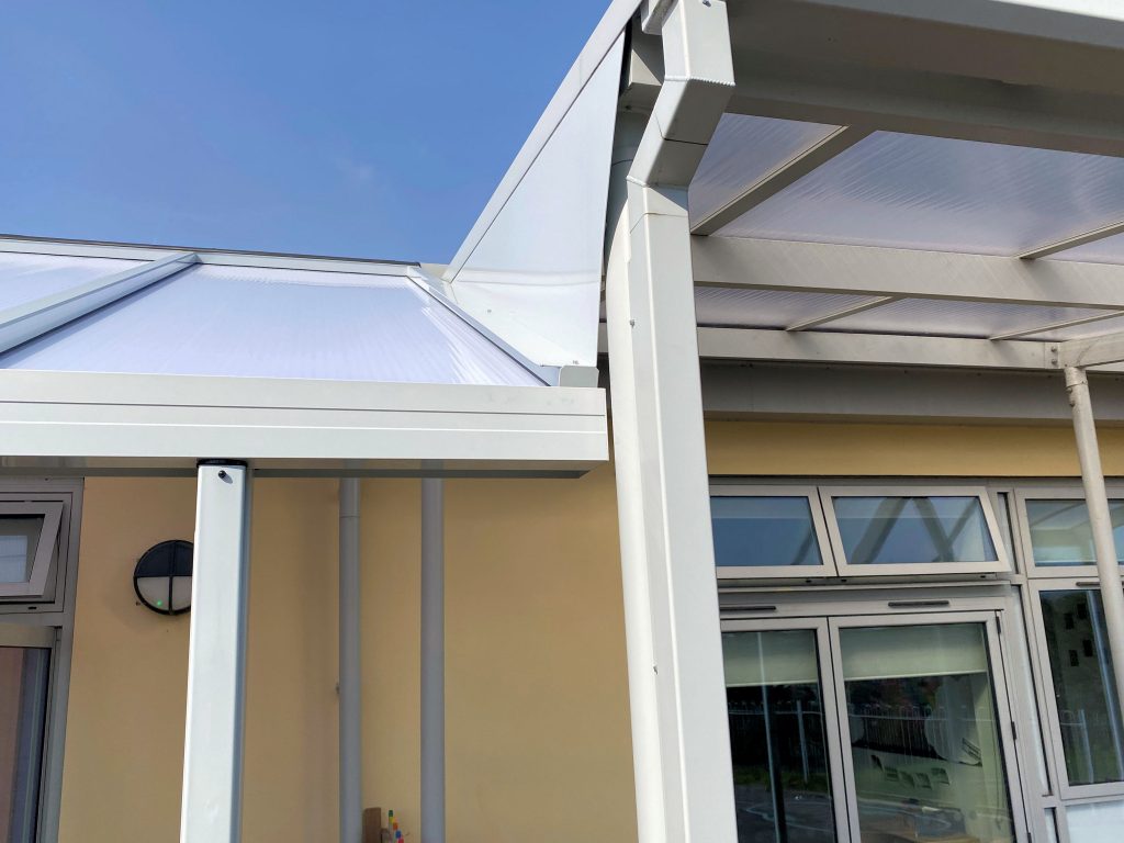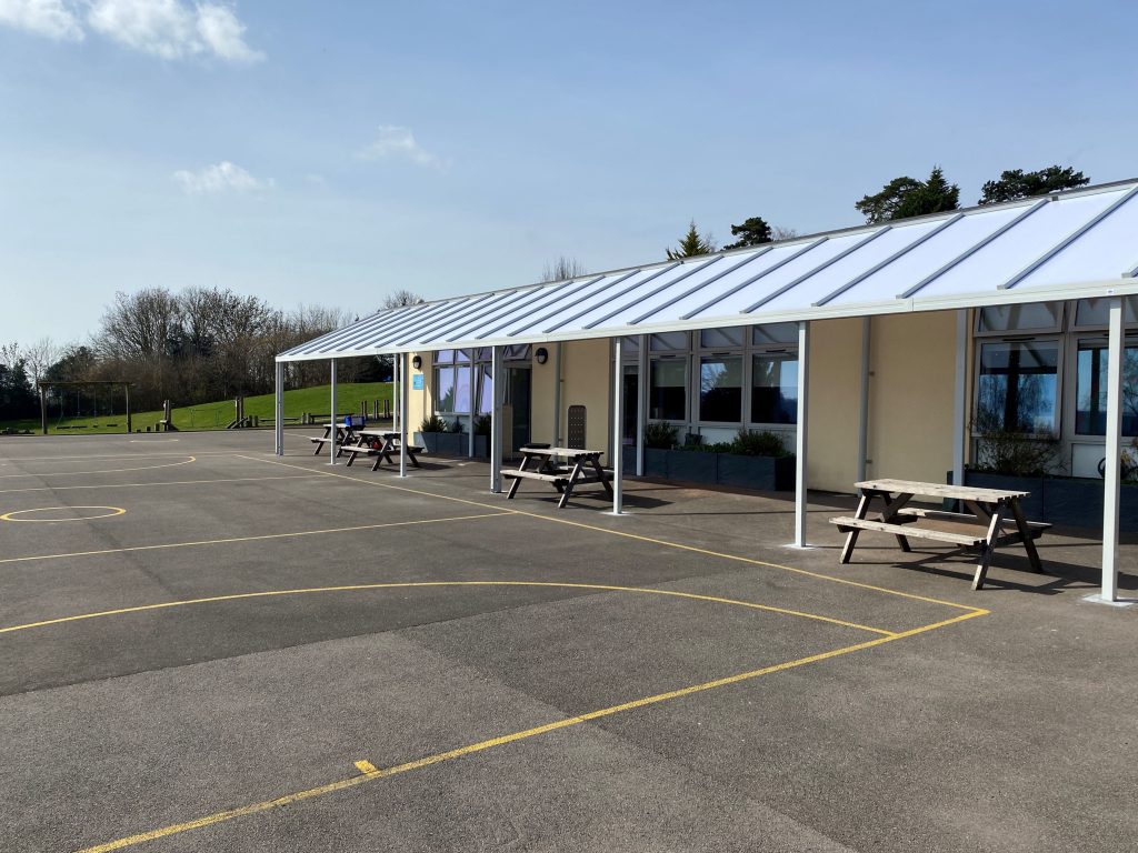 Following a Pre-Site meeting Able suggested that the New Canopy have a lower front height of 2400mm as this would provide greater protection from the weather, although the school had wanted the existing an new canopies to look as one, we provided a powder coated infill panel between the two canopies and as you can see the result looks great.