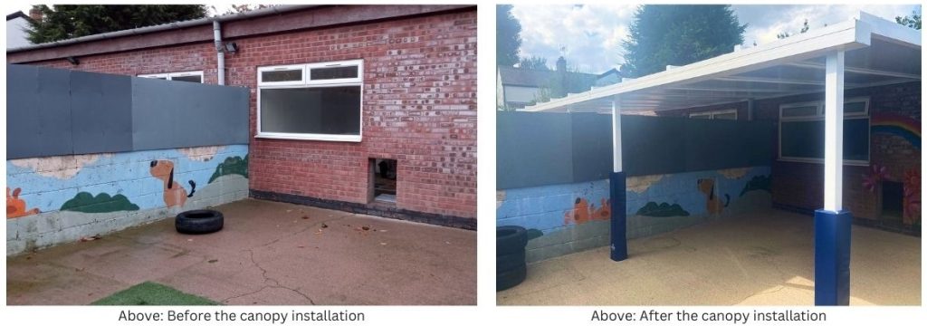 Satisfied with the quotation supplied and the canopy they’d seen at Oak Wood School, they placed and order for a 9m x 4m Coniston Wall Mounted Canopy with HeatGuard™ polycarbonate roof panels.