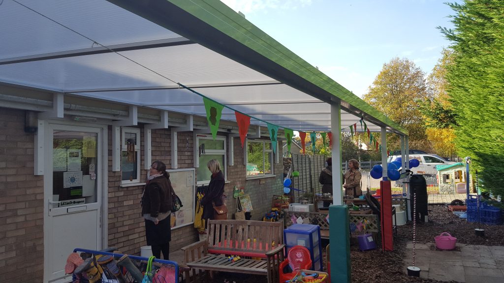 Our installation team installed this 10m x 3m Coniston Wall Mounted Canopy on Wall Brackets at Little Dragons Pre School creating a large covered outdoor area to the school grounds allowing the pupils to enjoy the outdoors throughout the whole year.