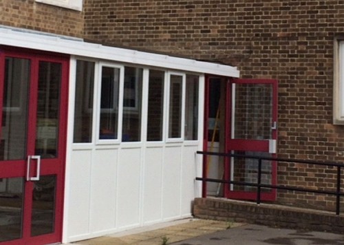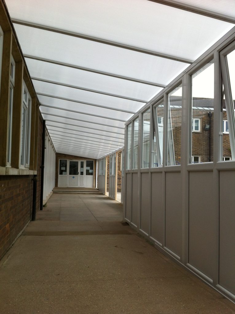 We supplied and installed a Coniston Wall Mounted Canopy with front fills, windows and DDA (Disability Discrimination Act) compliant, fire safe doors. This waterproof structure allows the pupils to walk through their new covered walkway whilst keeping completely protected from the weather all year round.