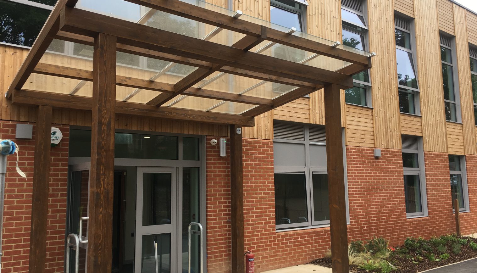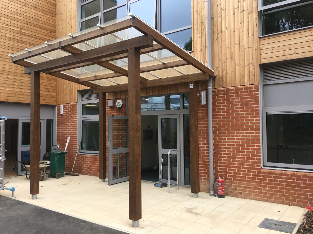For the entrance, we installed a 4m x 3m Tarnhow Mono Pitch Free Standing Canopy. The canopy is finished in the stain light oak and with 8mm toughened glass roof which sets the entrance off well. We also installed a Coniston on RSGP for the outdoor area.