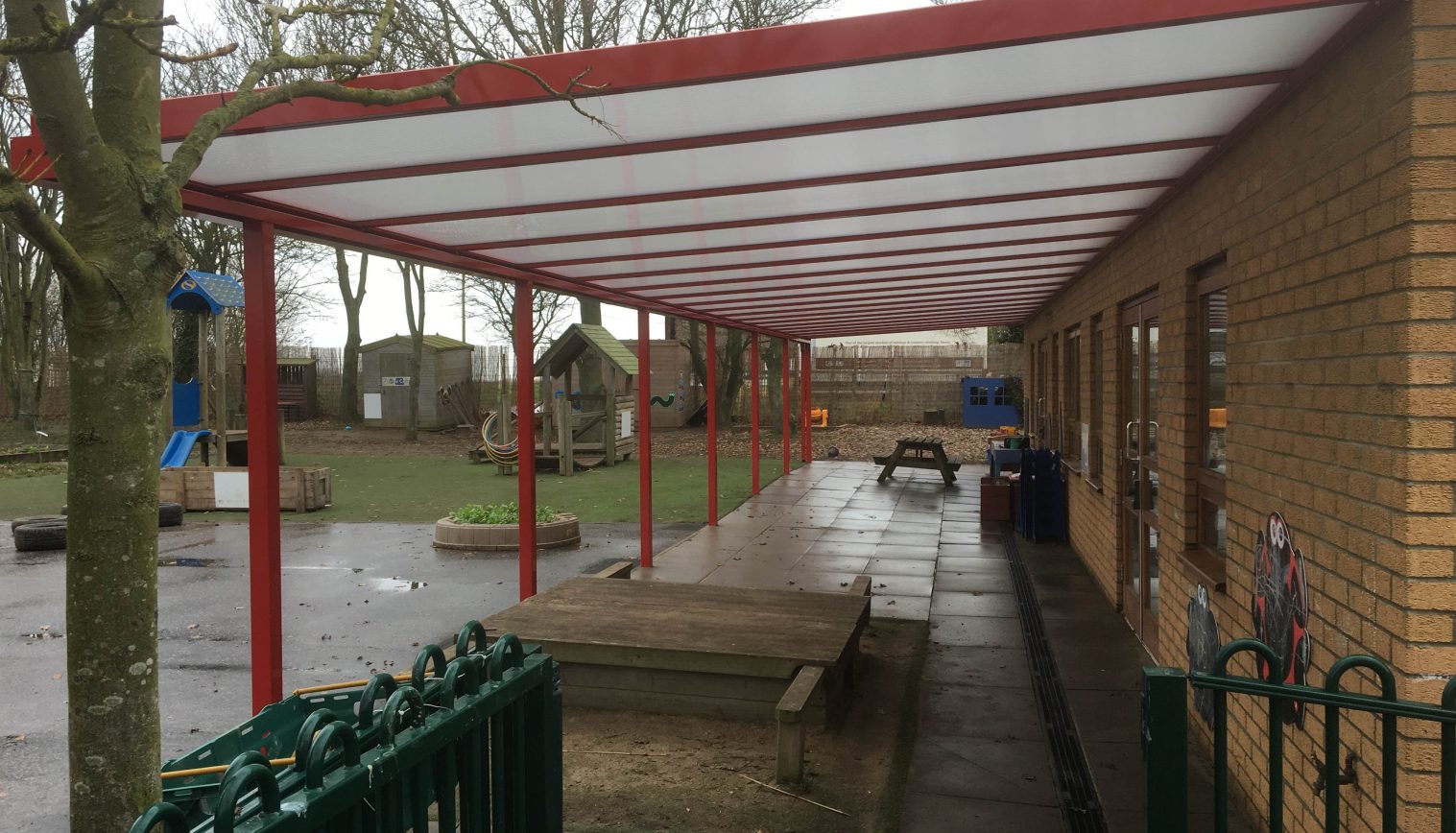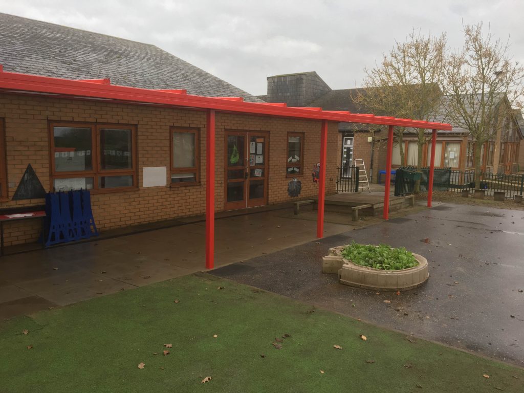 As required we installed a 18m x 3.6m Coniston Wall Mounted Canopy creating a large outdoor covered area which offers uninterrupted cover from inside to outside of the reception class rooms allowing the children to enjoy the outdoors all year round.
