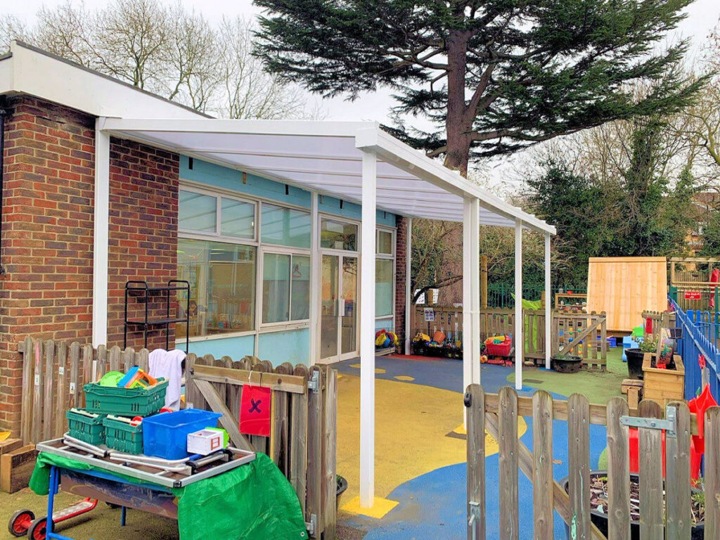 In January 2023, we supplied and installed a 7.8m x 3.2m Coniston Wall Mounted Canopy at Minster Nursery and Infant School in Croydon, London.
