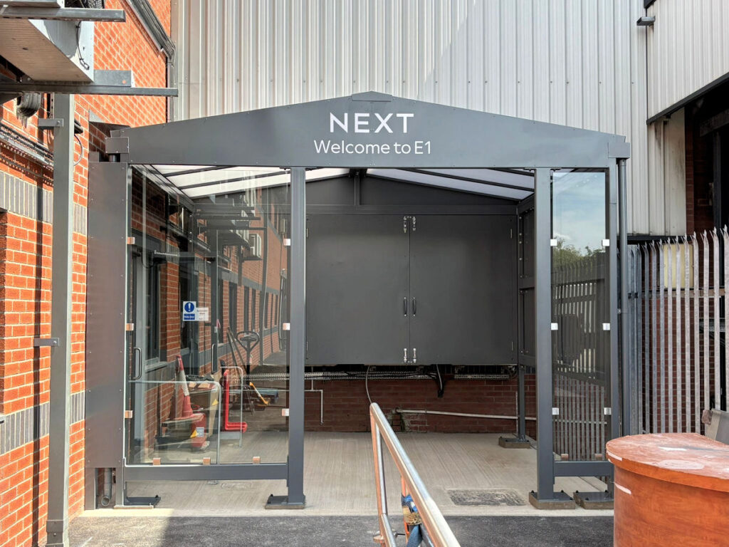 In June 2025, we supplied and installed a 3.3m x 4m Ullswater Apex Entrance Canopy with side fills at Next Distribution Centre in Wakefield, West Yorkshire.