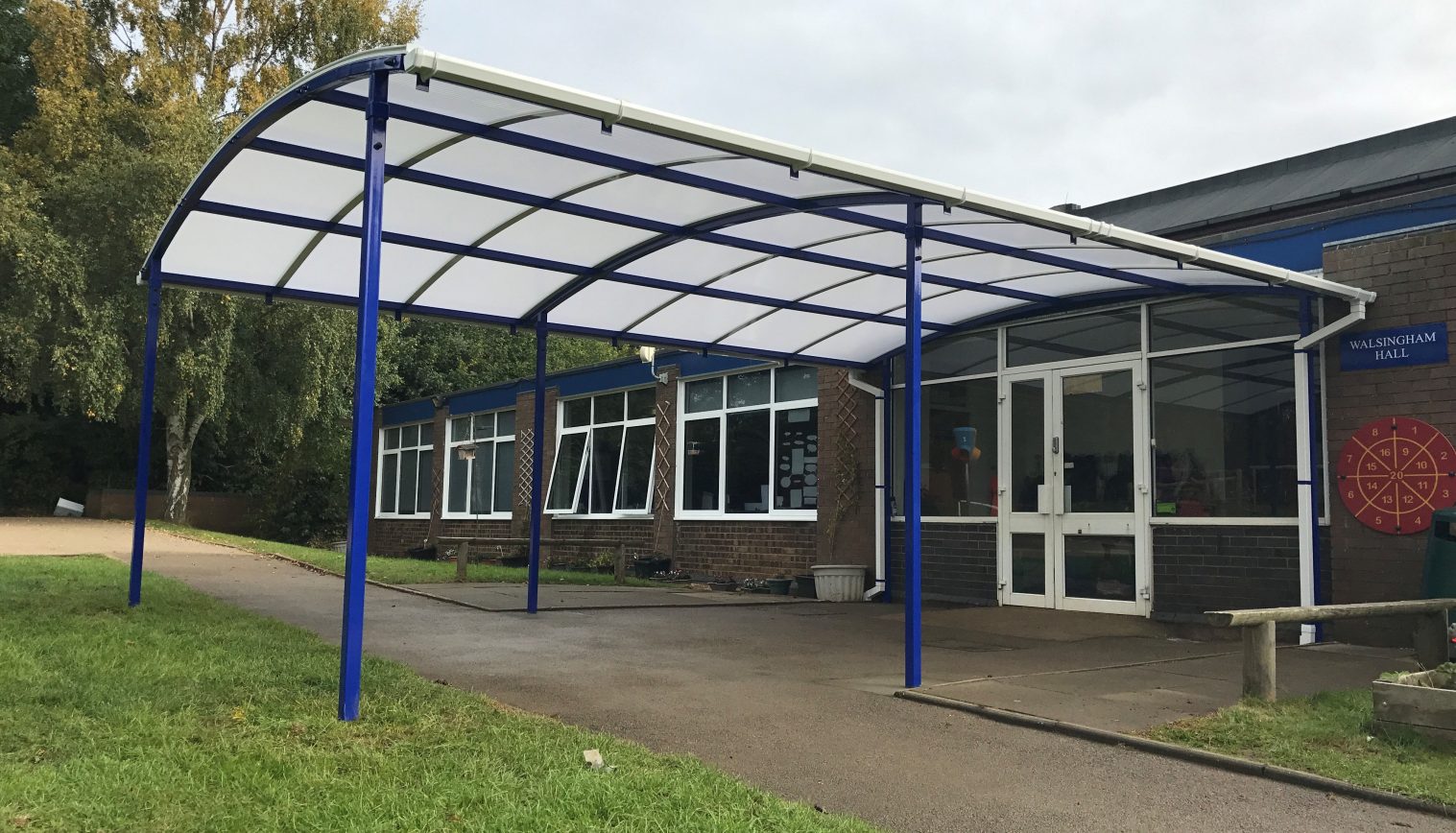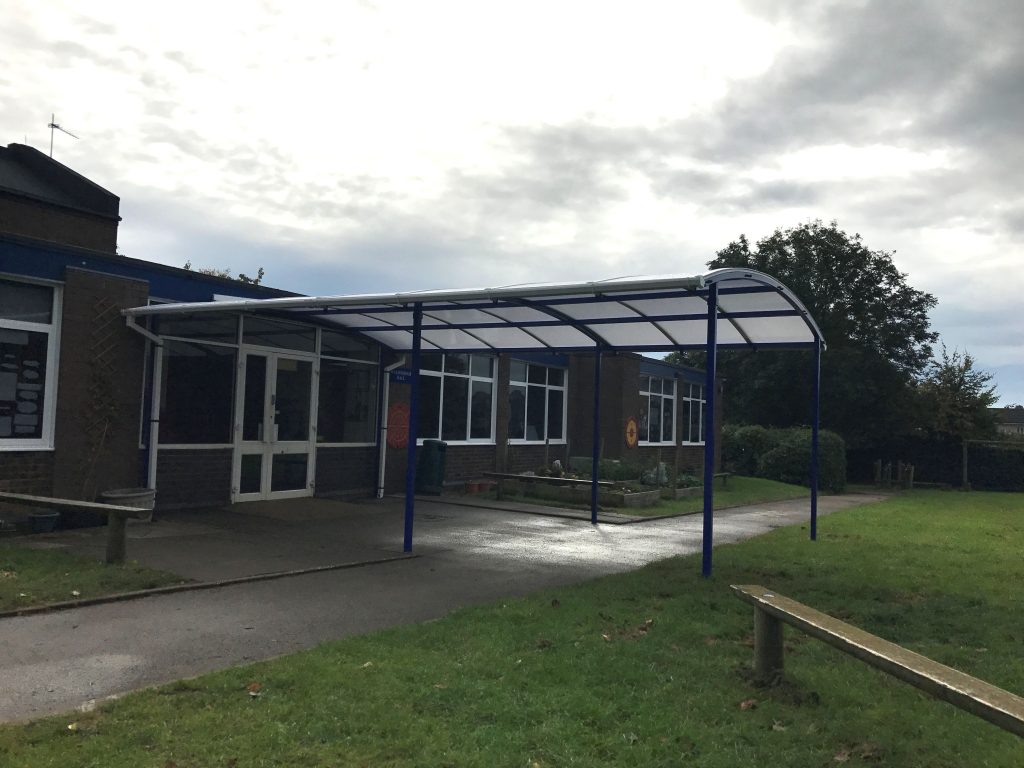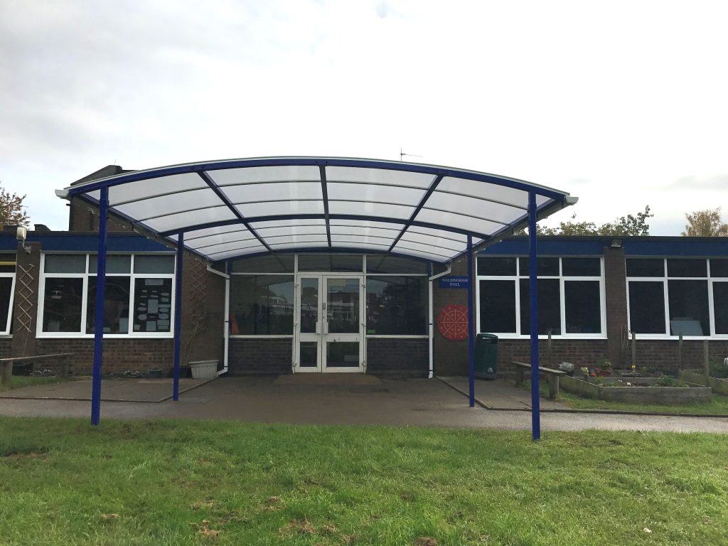 Our fitting team installed a 7m x 5m Welford Dome Junior Free Standing Canopy at Our Lady’s Catholic Primary School. The canopy created an attractive entrance to the building which means it now stands out to help new visitors to the school. The school choose for the frame of the canopy to be Ultramarine Blue which matched the rest of the surrounding buildings.