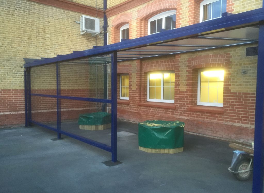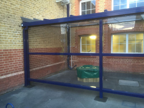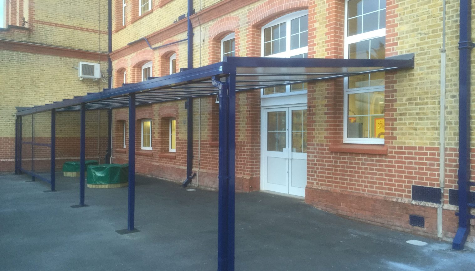 We supplied and installed a 13.85m x 3.5m Coniston Wall Mounted Canopy with two 5mm Front Fills. The school choose the canopy to be coloured Oxford Blue to match other areas of the school grounds.
