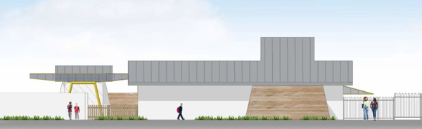 Above: The architect’s design of the school with the bespoke canopy to the left of the building and one of the wall mounted canopies to the right.