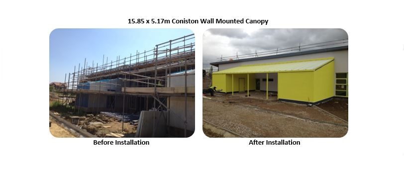 Phase 1 included the installation of the Coniston Wall Mounted Canopies. These canopies were installed over a 2 week period. During this timescale, we fitted the 3.6m x 2.3m & 5.3m x 2.3m Coniston first. Due to the builder’s presence on-site, we liaised with them, and it was agreed that we were to return 1 week later to continue our works and install the 15.85m x 5.17m Coniston as shown in the images below. This way our installation and the contractors works would not overlap, and all building and installation works could be completed without any issues.