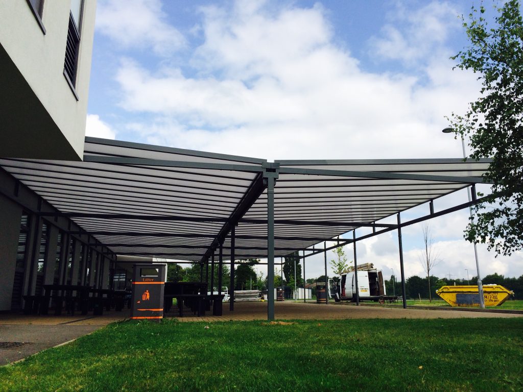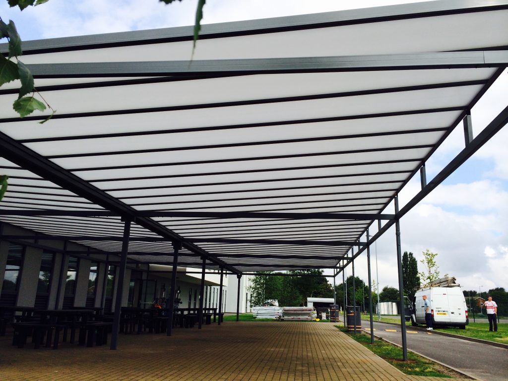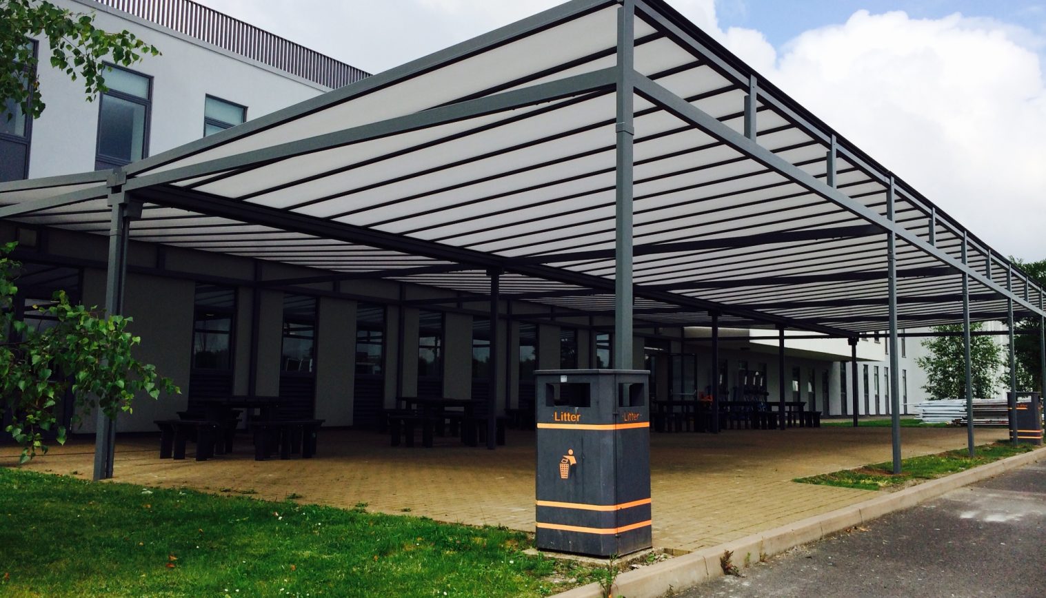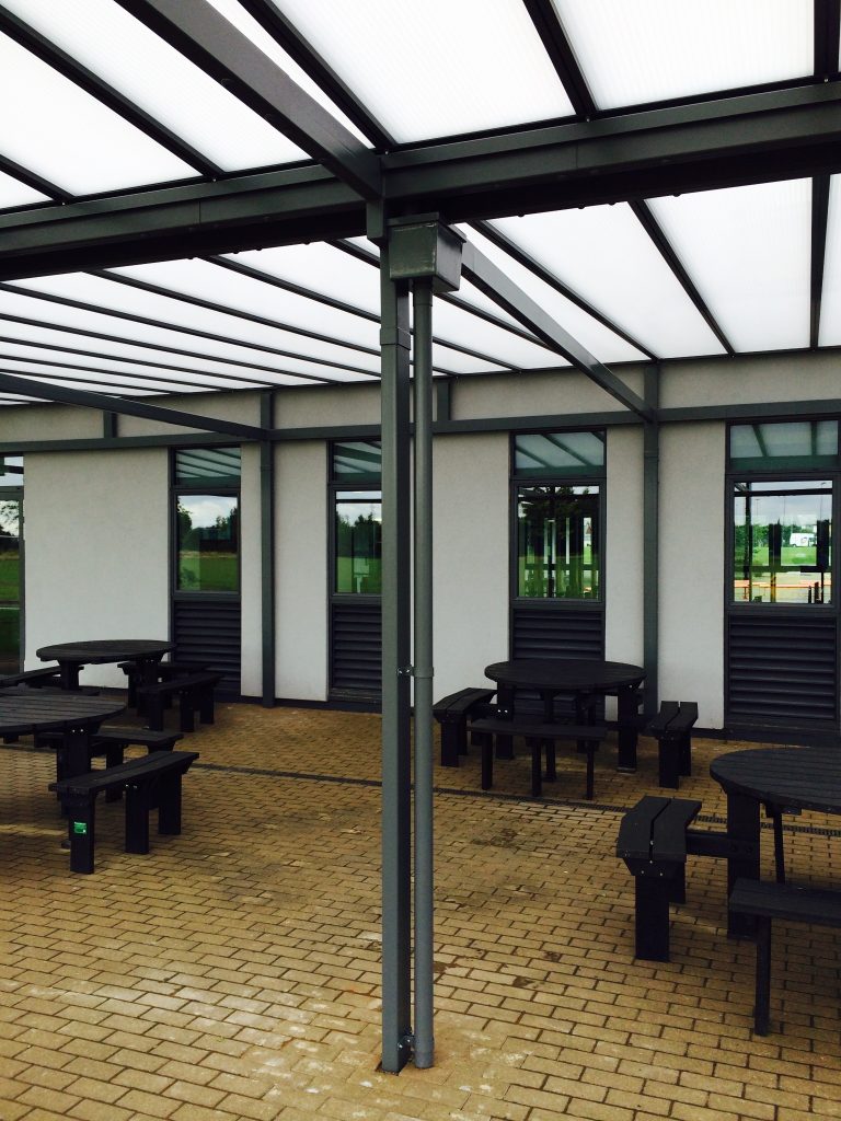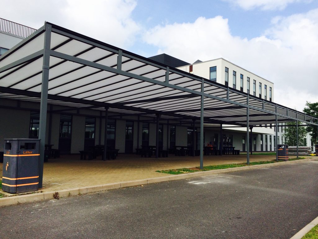 RSA Academy required a large structure to create cover for their outside dining area where they already had picnic tables installed. They were interested in the features of the Double Grange Free Standing Canopy but with a slightly different appearance.