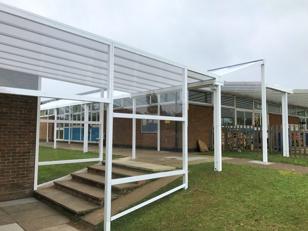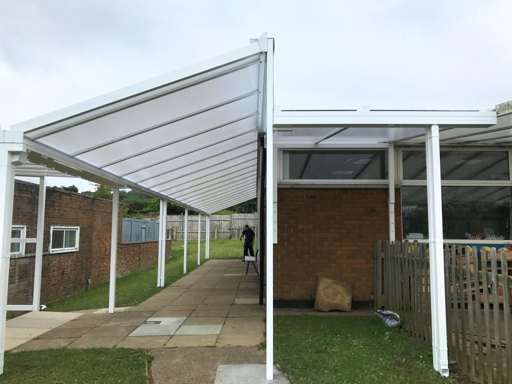 We recently installed a 18m x 2.5m Coniston Wall Mounted Canopy, with a Gullwing Valley going into 3.5m x 6m, 2m x 3.5m space at Shawley Community Primary School. This created shelter from rain and snow and gives shade from the sun with high UV protection. It also helps the school to keep their classroom interiors cool.