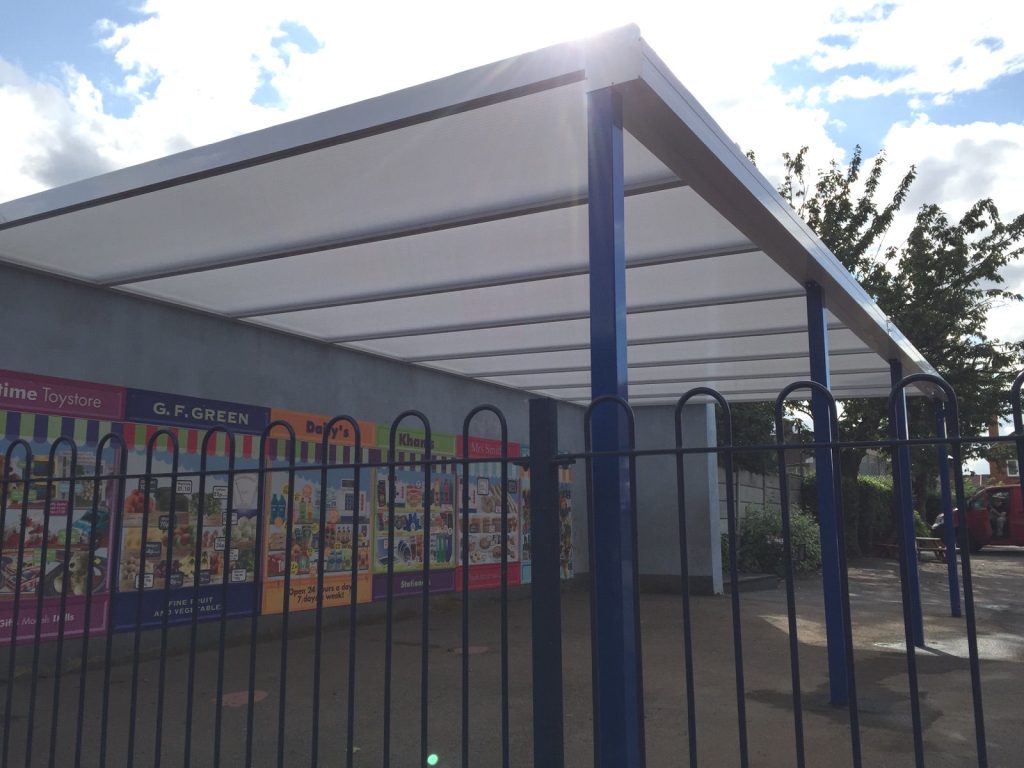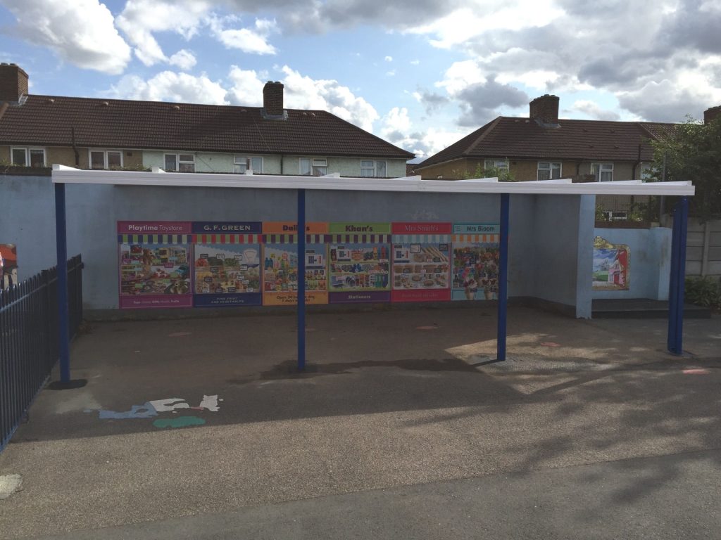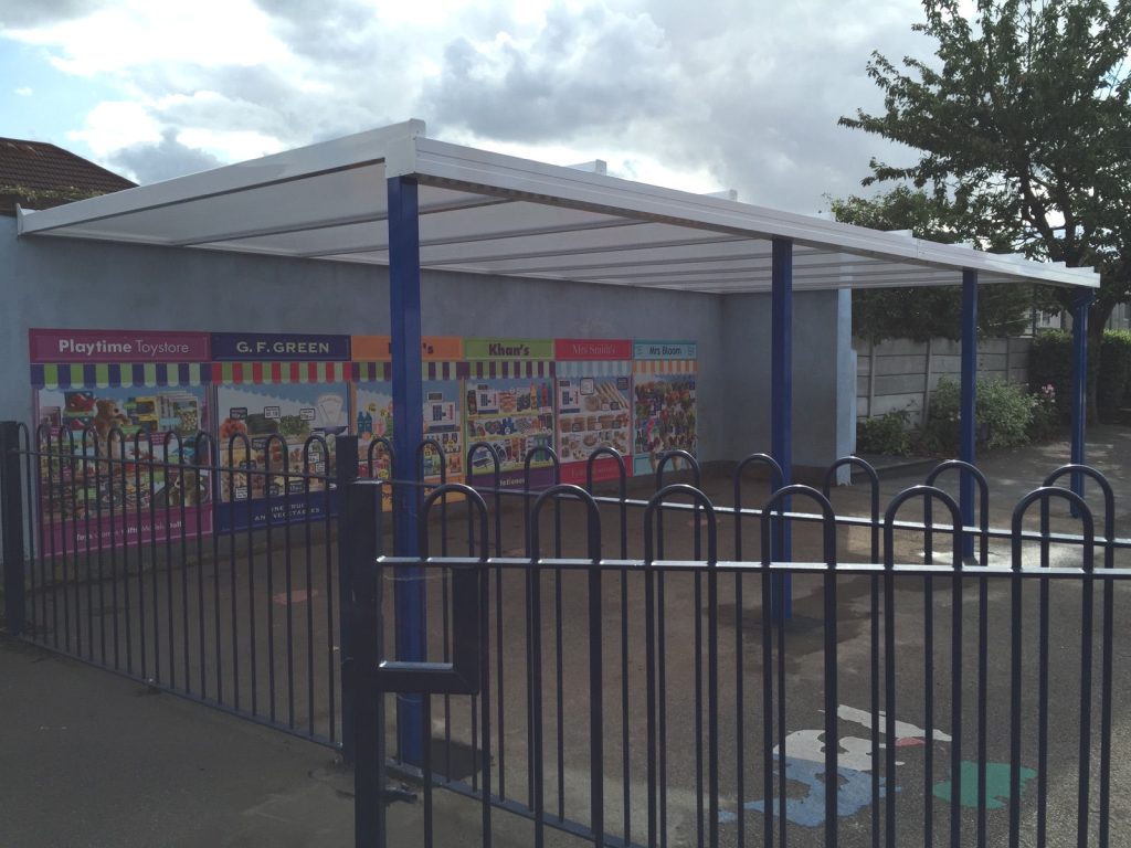 In August 2015, we installed a 7.75m x 4m Coniston Wall Mounted Canopy at Southwood Primary School creating a covered outdoor area that can be used for a learning and playing throughout the year. The school choose to have the posts coloured blue making it a bit more personal.