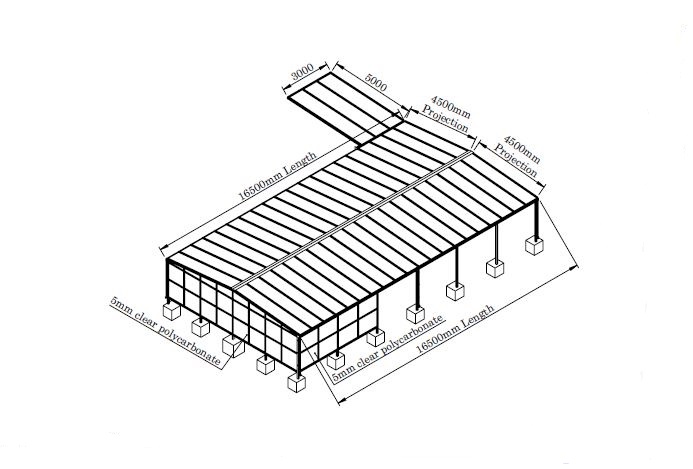 Following a detailed site survey in December 2024, our team recommended the installation of a Coniston Apex Freestanding Canopy which is two Coniston Freestanding Canopies, positioned back-to-back to form a spacious 16.5m x 9m covered area, totalling 148.5 square metres. To enhance accessibility and weather protection between the building and the new canopied space, we also installed a 5m x 3m Coniston Wall Mounted Canopy.