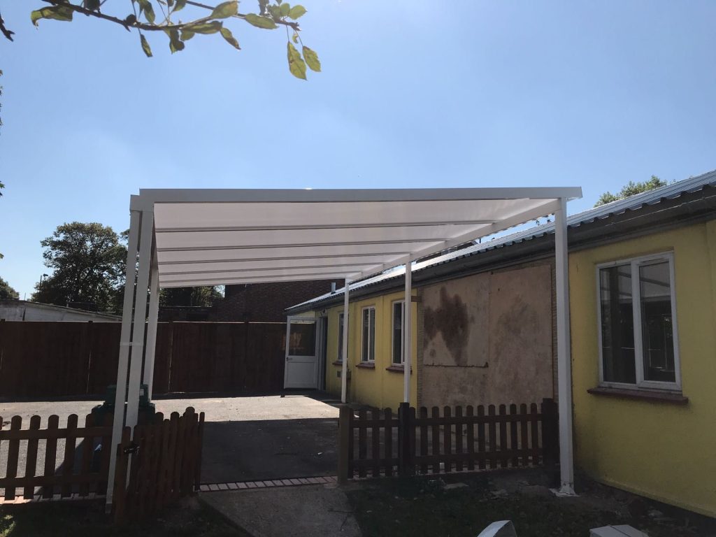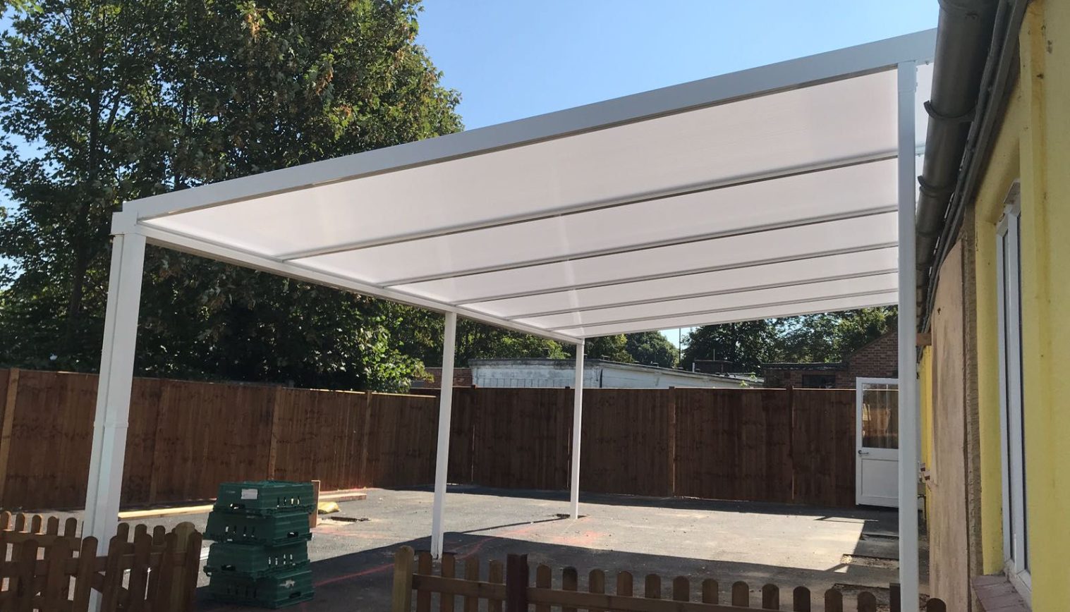 GlazeMe contacted us on behalf of St Cedds School in Chelmsford. They wanted to add a covered area to the school playground. To meet the requirements we installed a 7.5m x 4.25m Coniston Wall Mounted Canopy on Rear Steel Goal Posts.