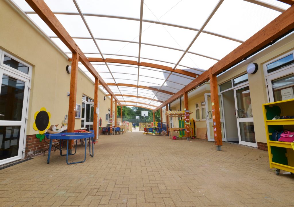 St Joseph’s Catholic Primary School wanted to provide shelter between two of their buildings, which could be used as an outside play and learning area. We provided the school with a 21m x 6m Tarnhow Curved free standing canopy which will create shelter whatever weather.