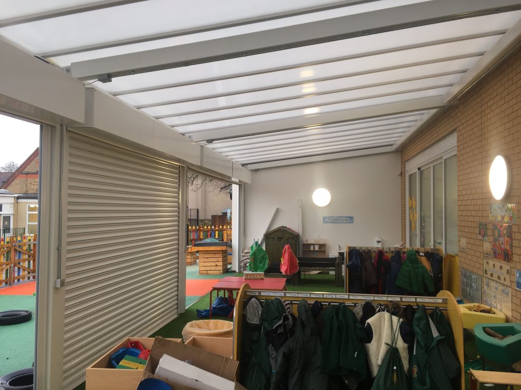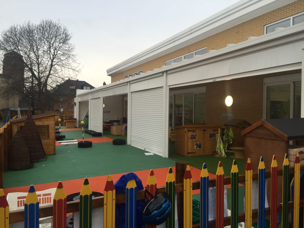 We installed a 23m x 4.5m Coniston Wall Mounted Canopy with Secure Roller Shutters as an optional extra. This created a large outdoor covered area which allows the pupils to use the outdoor space whatever the weather. The Secure Roller Shutters create a lockable storage area that can be used at the end of each day as well as a more enclosed canopy.