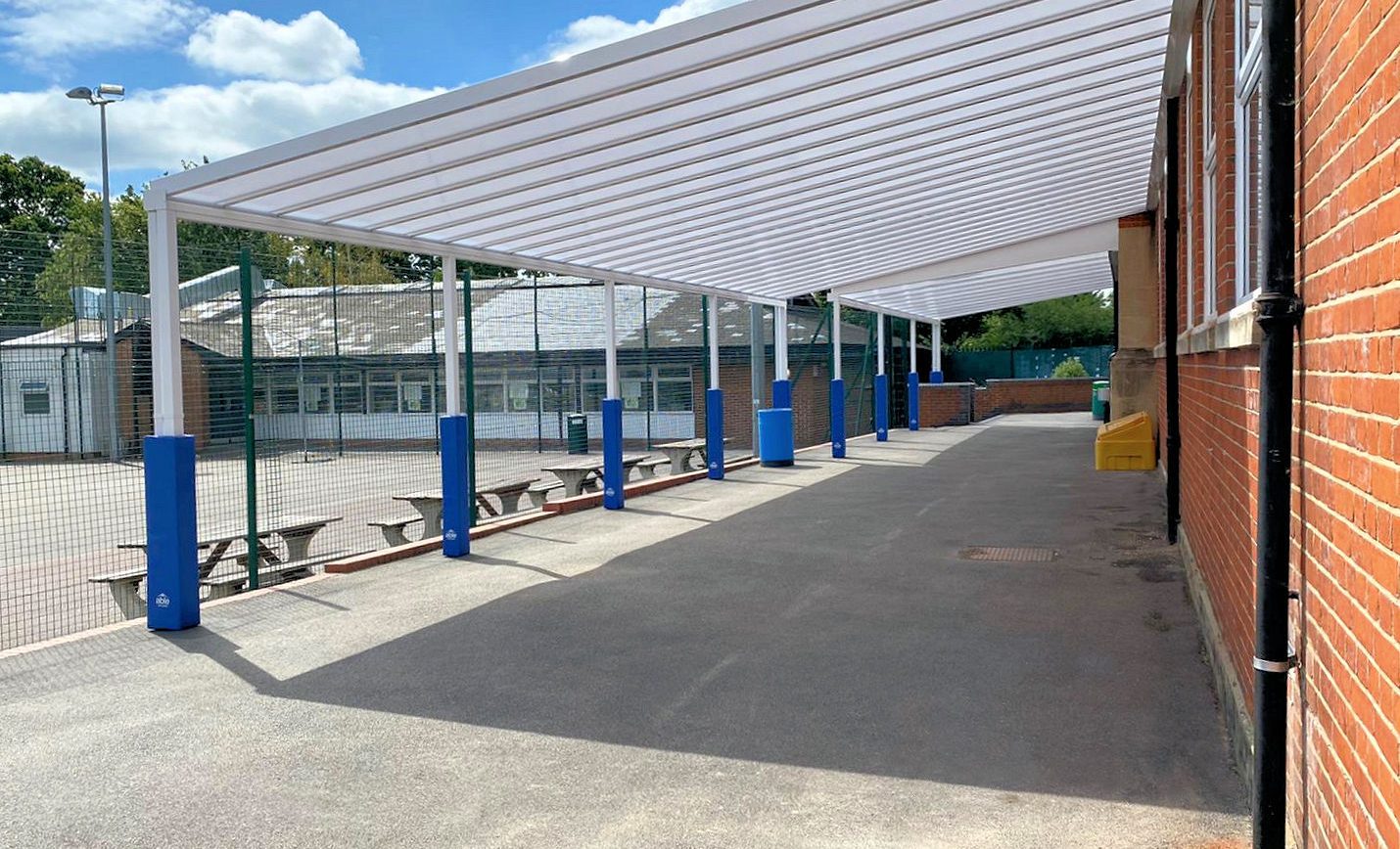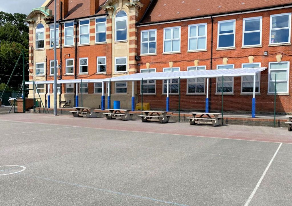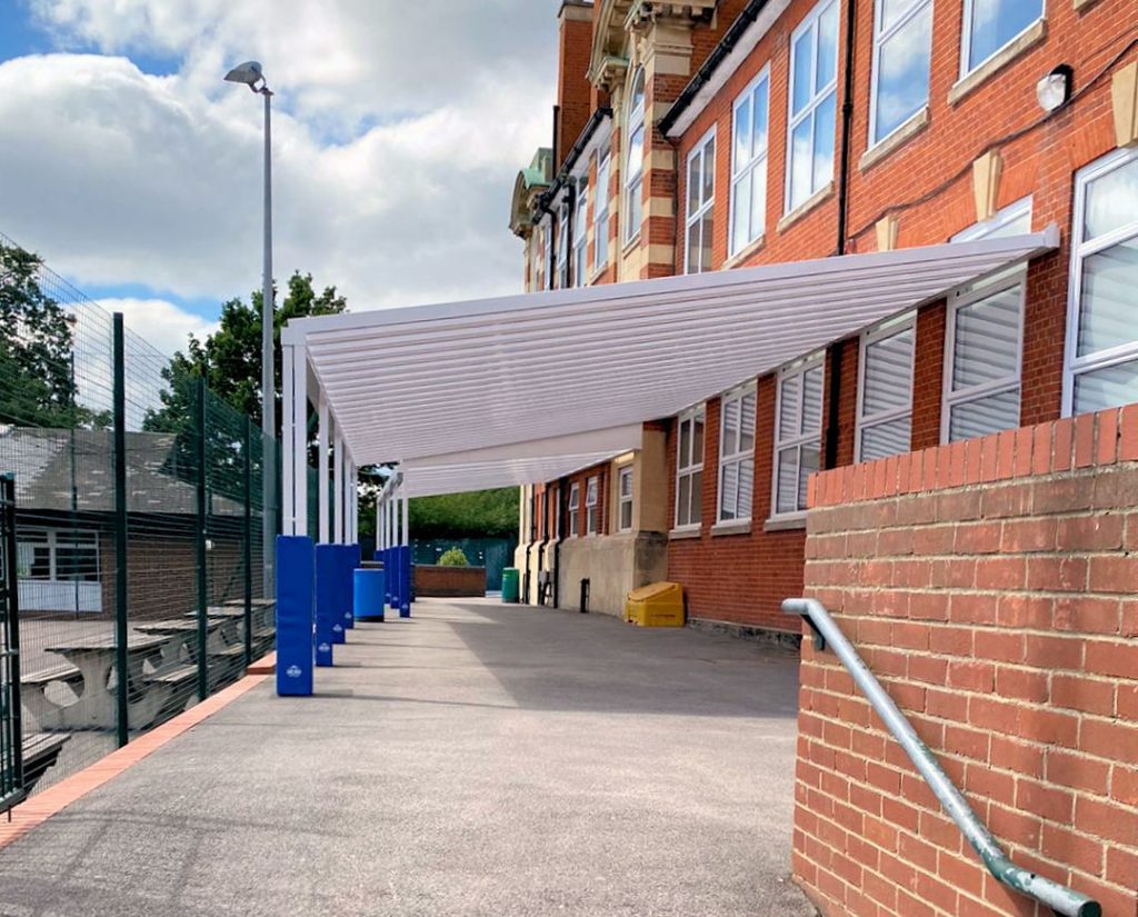 Able Canopies Ltd supplied and installed two Coniston Wall Mounted Canopies at St Thomas More RC School in Wood Green in London. The Coniston creates shelter from the rain and snow and shade from the sun with high UV protection, allowing the students to enjoy the outdoors in all weather conditions.