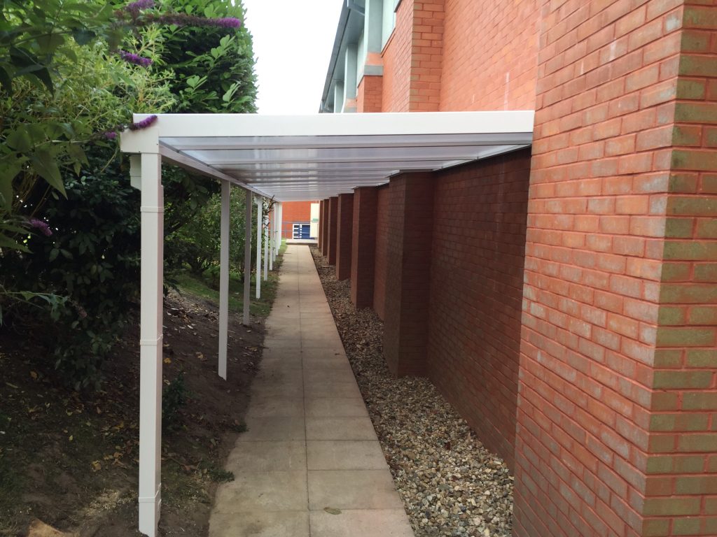 We supplied and installed a 4.9m x 2.3m & 1.9m Coniston Wall Mounted Canopy. The Coniston creates shelter from rain and snow and shade from the sun with high UV protection which allows the walkway to be used all year round.