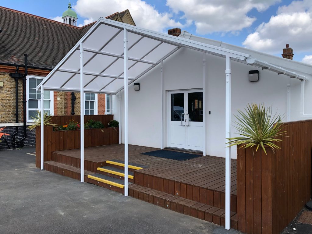 BRM Associates Ltd were working on a project at Telferscot Primary School in Balham, London. They were looking to have a canopy installed to one of the classrooms creating an outdoor covered area. After discussing the different options we could provide them, we installed a Bespoke Grange Junior Free Standing Canopy creating the outdoor covered area they were looking for.
