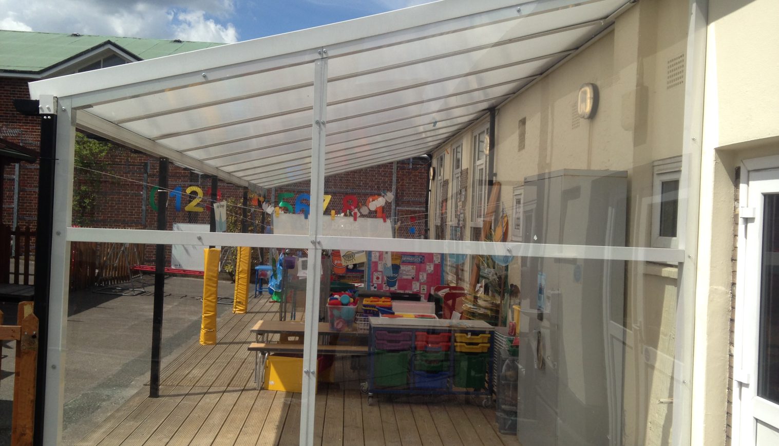 The Good Shepherd Primary School already had a Coniston Wall Mounted Canopy installed and wanted to extend it by another 5 metres. They also had a 5mm solid polycarbonate side fill add on in May 2014.