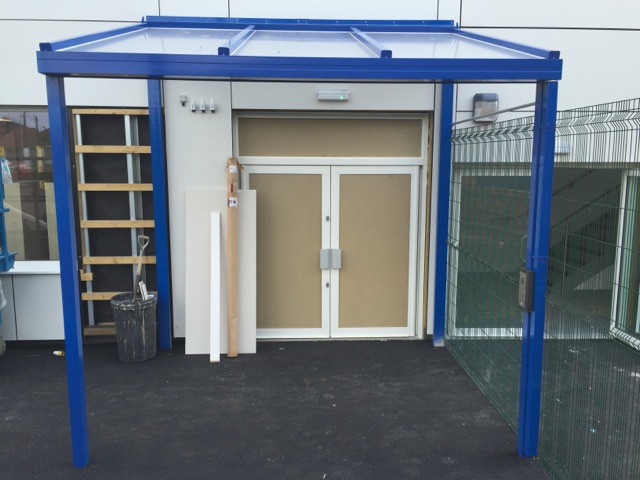 We supplied and installed a 30.68m x 27.4m Coniston Wall Mounted Canopy with goal posts to create a large covered walkway adjacent to their building which can have various uses. We also installed a 3.2m x 2.41m Coniston Wall Mounted Canopy for use as an entrance canopy outside their entrance doors. Both canopies were fitted with rear steel goalposts as the building was not suitable for fitting a canopy to. The canopies were also finished in Signal Blue (RAL 5005) to match their existing colour scheme.