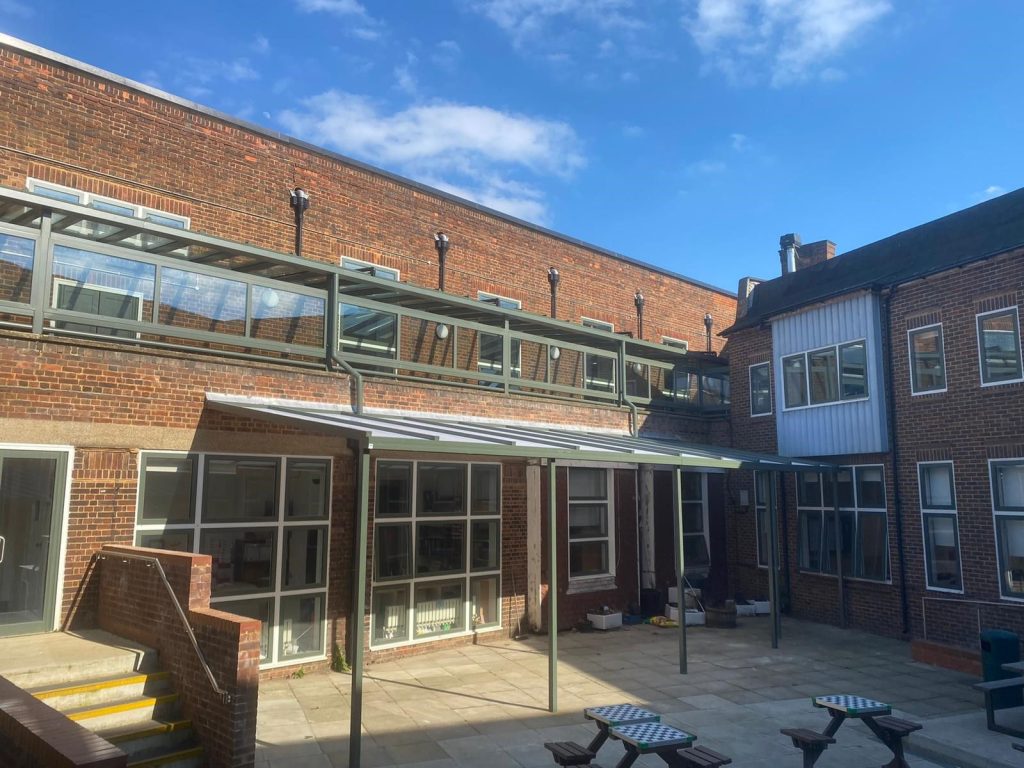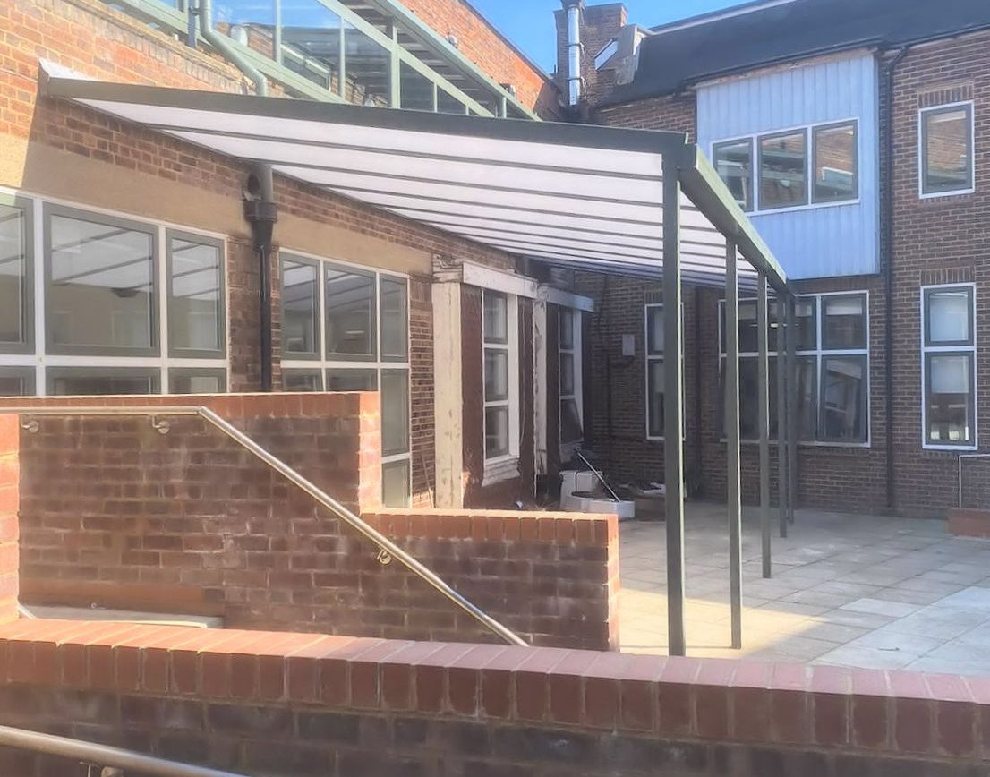 In March 2021, we installed a Coniston Wall Mounted Canopy at William Ellis School in Highgate, London. The canopy was installed in the RAL colour Green Grey RAL 7009 to match the Coniston Wall Mounted Canopies we installed at the school in 2020.