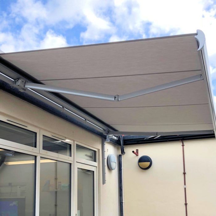 Able Canopies’ full cassette awnings are contemporary, retractable awnings that have been designed for well used, busy outside spaces. They can be opened and closed with the touch of a button using the remote control supplied or, alternatively we can supply the awning with a manual hand crank instead for those that would prefer not to have electronic controls.