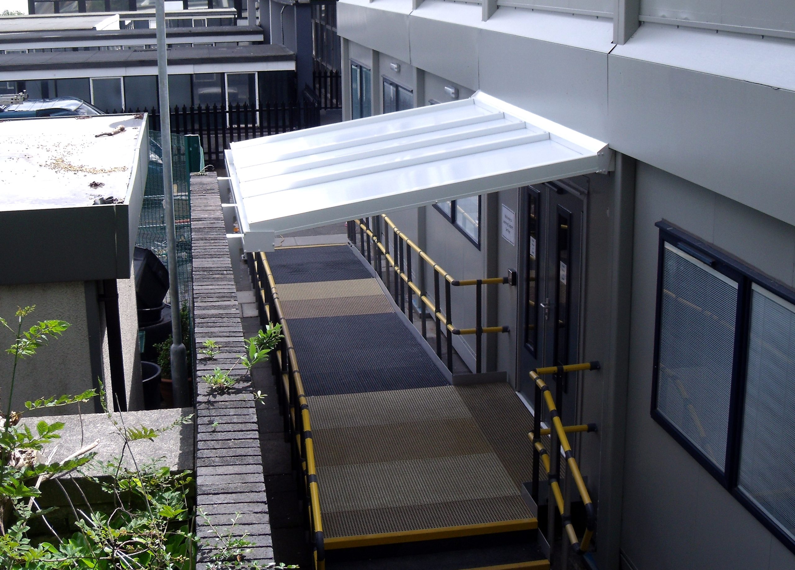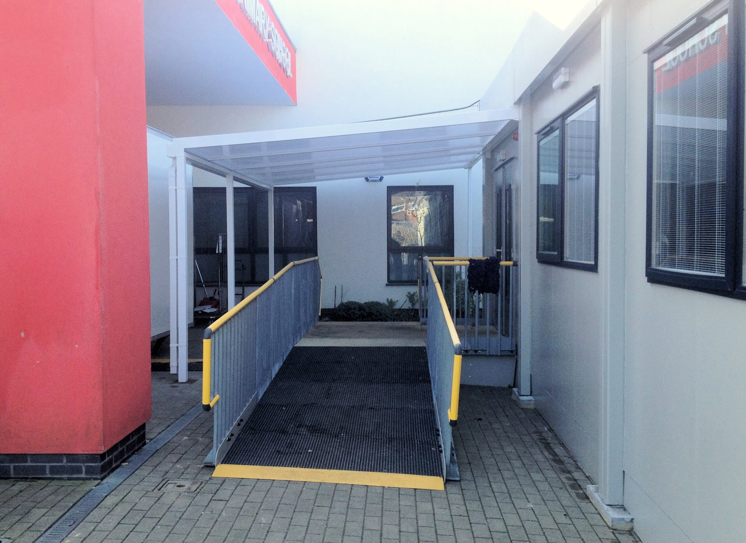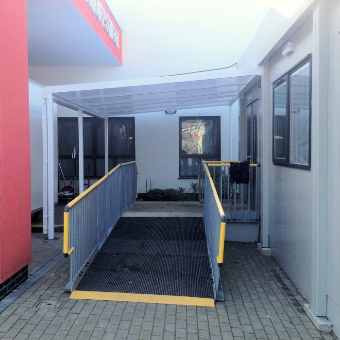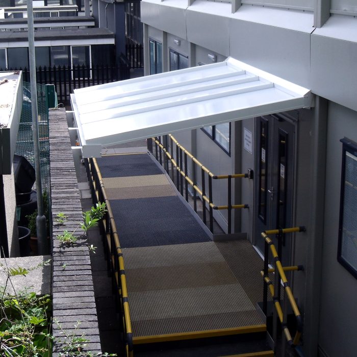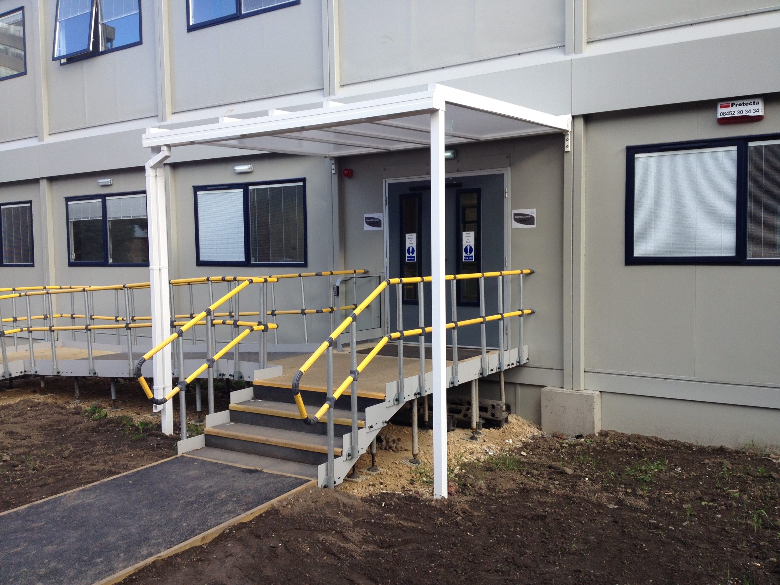 Having worked with modular buildings specialists for many years, our canopies are the perfect partners for your temporary buildings. From the first time we worked with a modular building, we understood that they require a different fixing method and therefore designed special brackets. These special brackets have different fixing points so the canopy can still be mounted onto the wall, creating full weather protection, whilst fixing to the building safely and effectively, without causing damage.