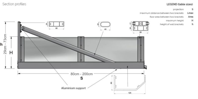 - Cantilevered – The canopy is fixed to the wall with aluminium wall brackets and upper linkages