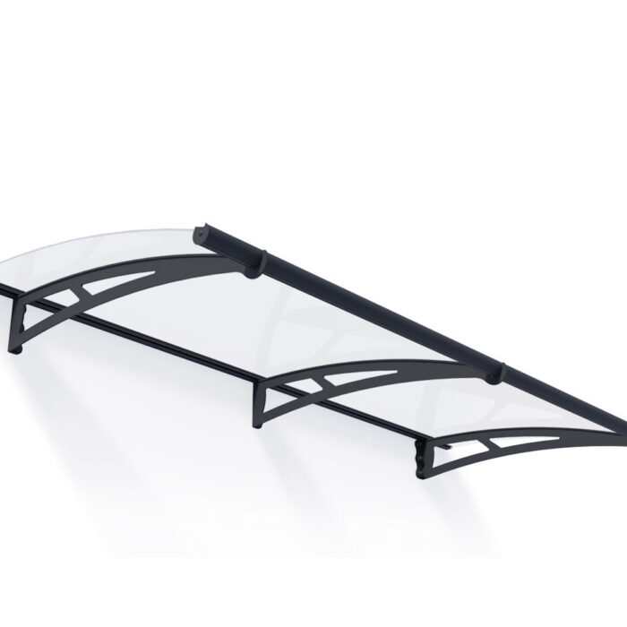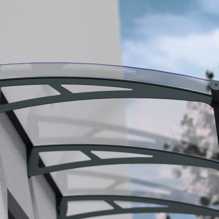 The Dalwood Entrance Canopy framework including the aluminium main frame and the steel support arms are powder coated in Anthracite Grey (RAL 7016).
